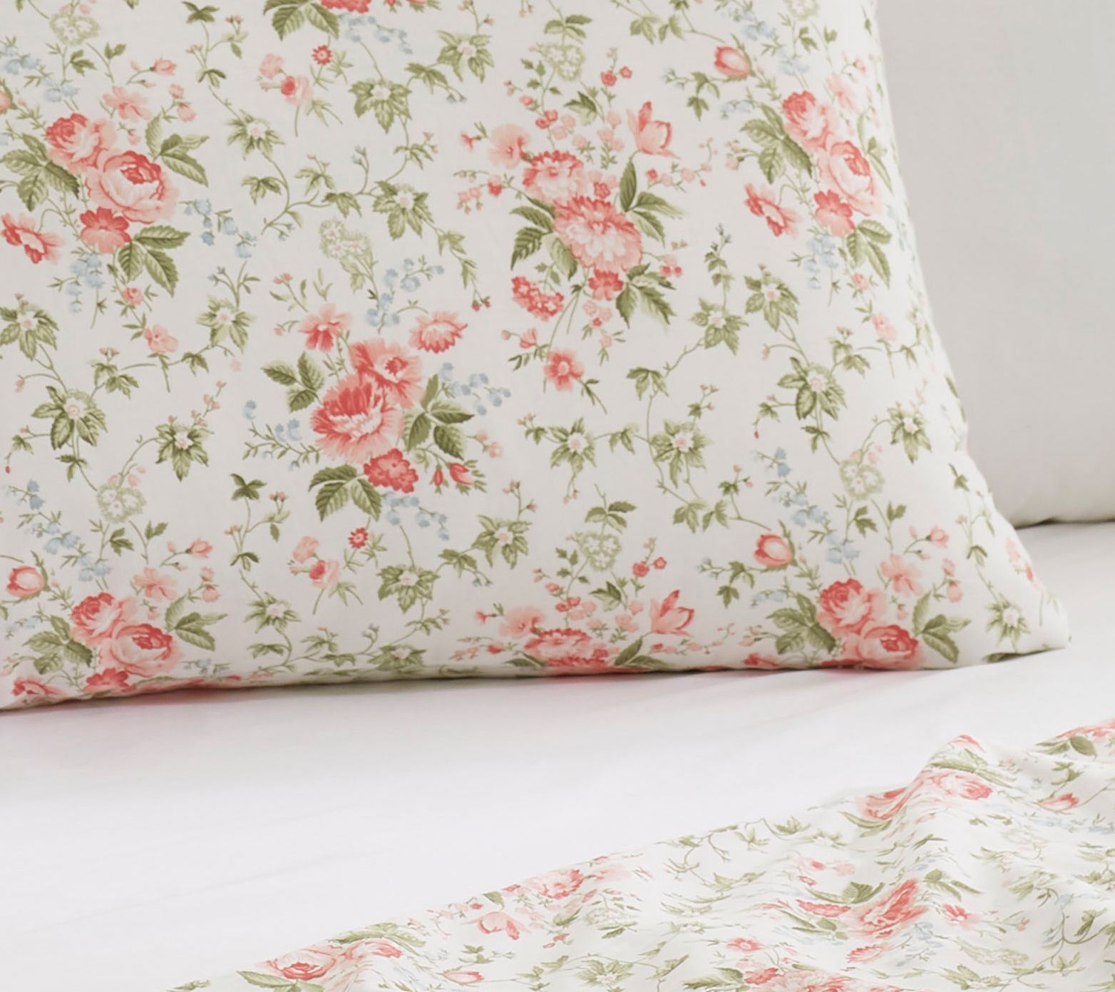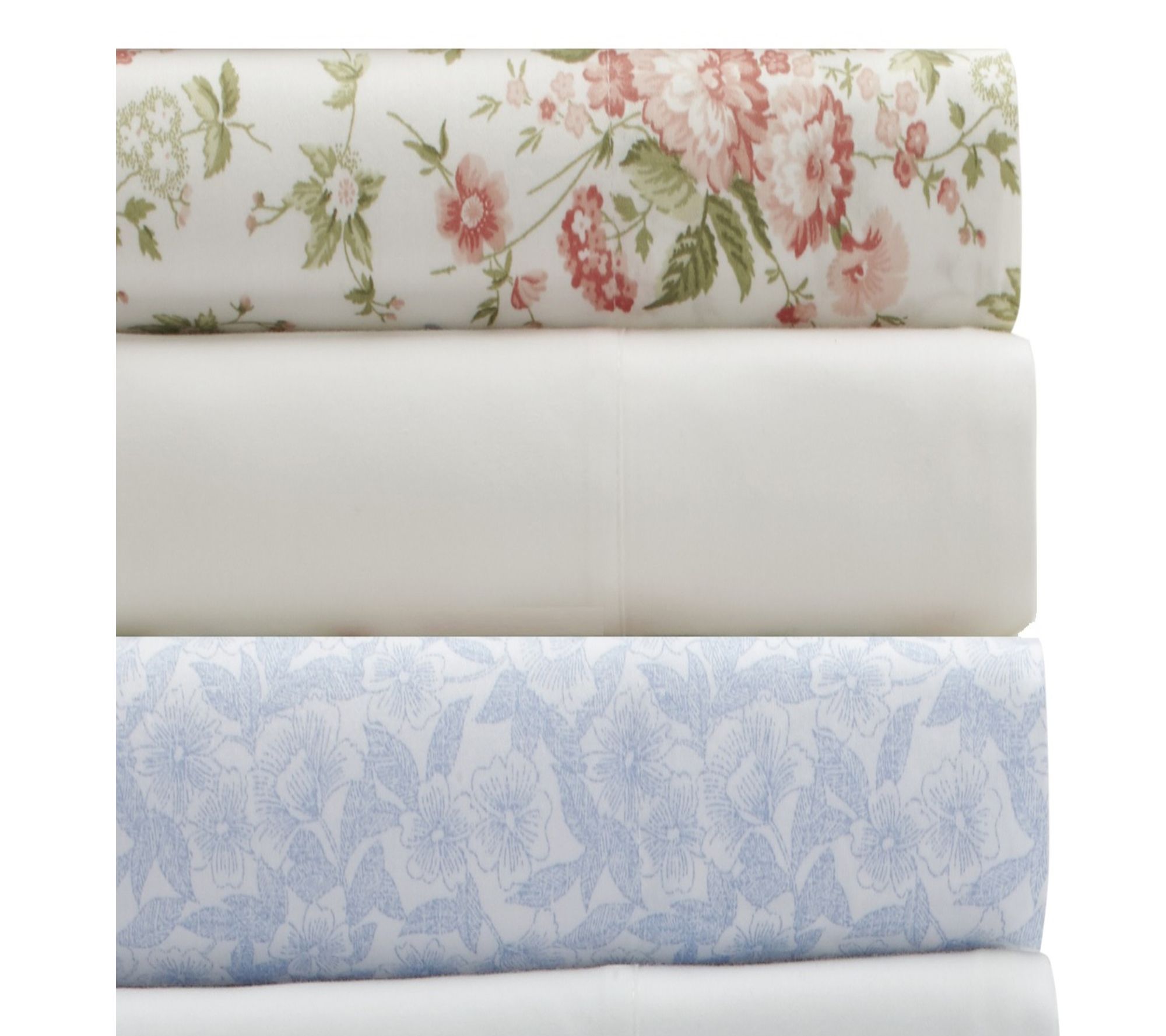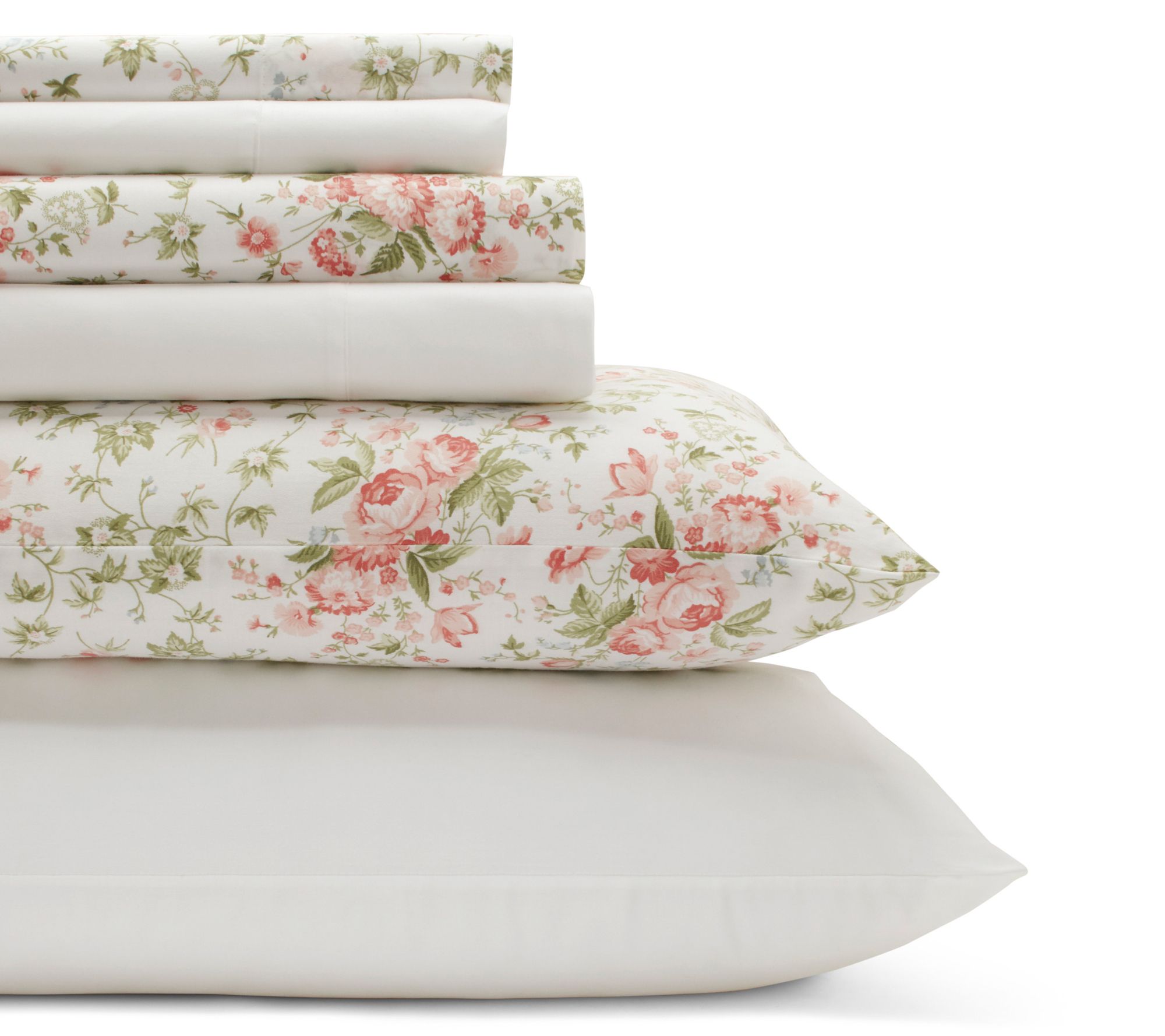 Add a touch of vintage charm to your bedroom with the Laura Ashley Marissa cotton sheet set. This stylish six-piece set features a delightful mix of floral patterns and solid colors, perfect for creating a cozy and coordinated look. From Laura Ashley.