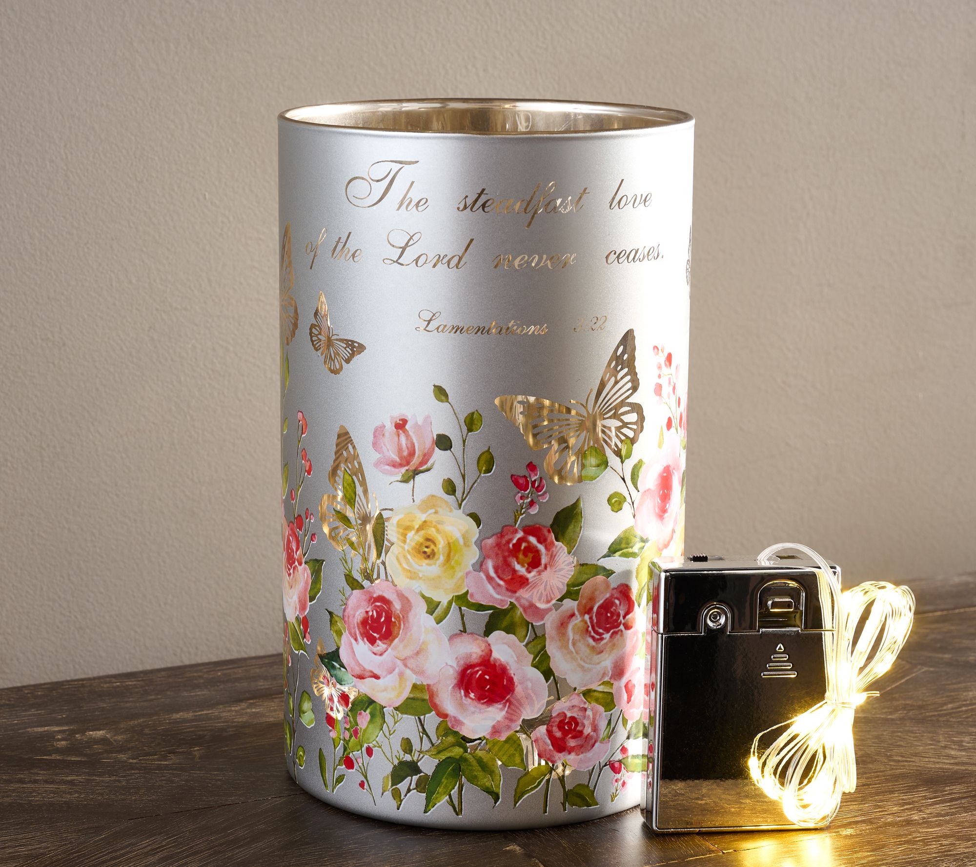 Add a serene glow to your home and create a spot for reflection with this charming illuminated prayer garden hurricane. The delicate etched design features butterflies hovering above a leafy garden and inspirational scripture. From The Valerie Parr Hill Collection.