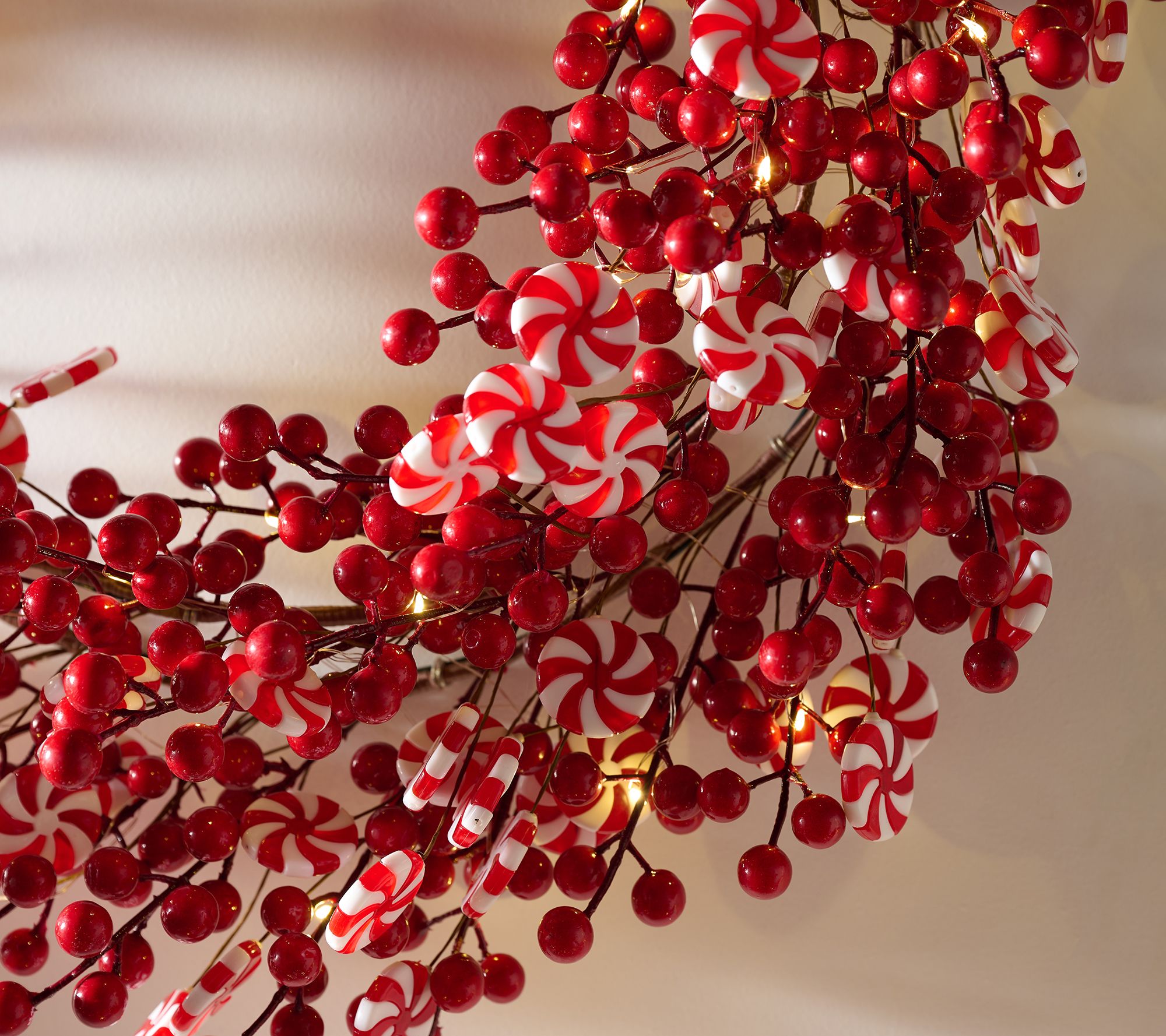 Holiday cheer starts at your entryway when vibrant peppermint swirls and berry accents welcome guests with festive flair. Whether brightening your living room wall or jazzing up the dining room, this pre-lit wreath adds a pop of color and a dash of whimsy to seasonal gatherings -- just hang it up and let the festivities begin. From Kringle Express.