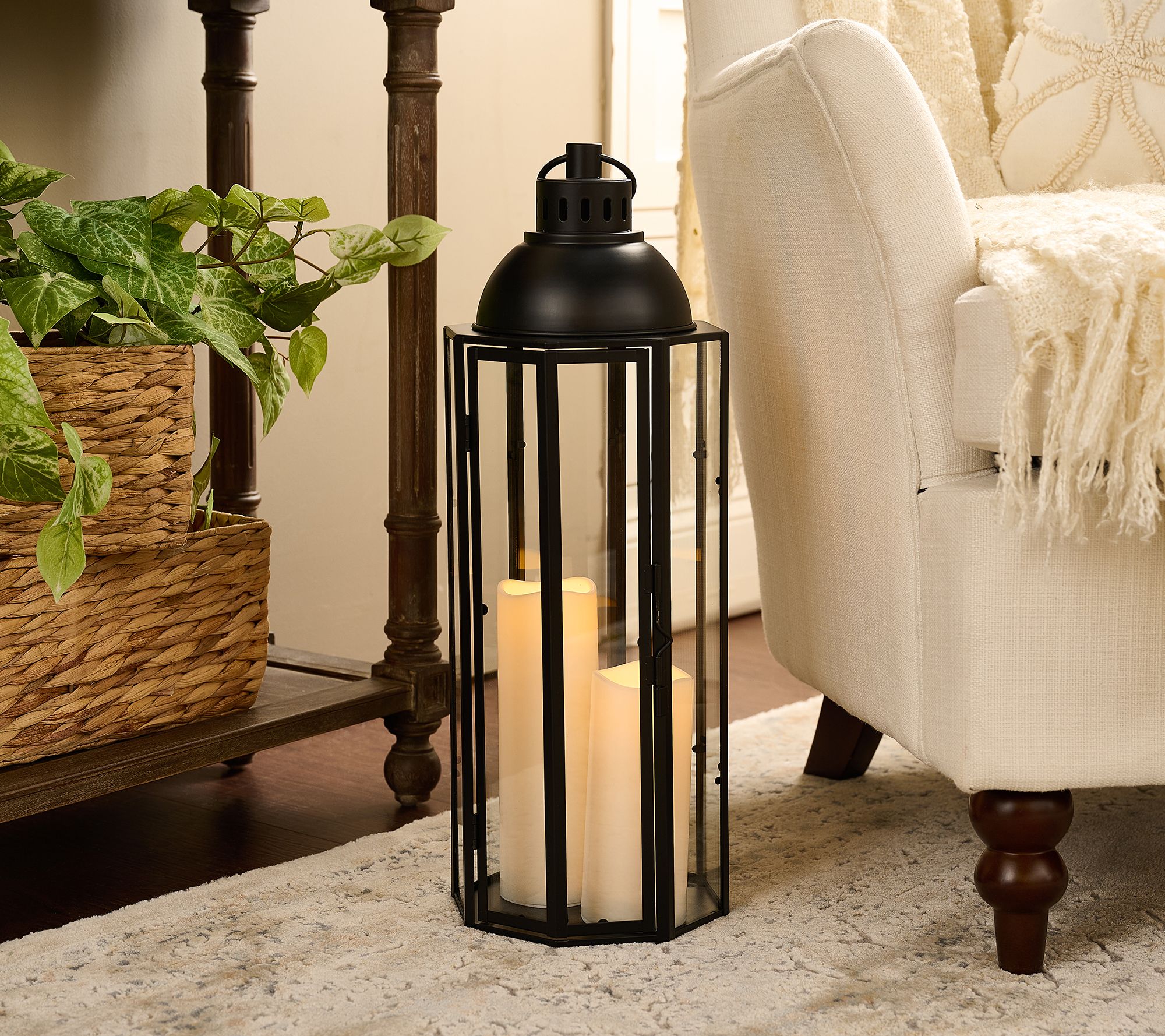 Dinner on the deck? You'll have plenty of illumination for apres-meal conversation with Home Reflections® luxe oversized lantern to light up the night. With two flameless pillar candles lending a warm glow, catch up on convos with fam and friends well past sunset on the patio or add inviting charm to a porch or entryway. The included remote provides instant illumination with just a touch. From Home Reflections®.