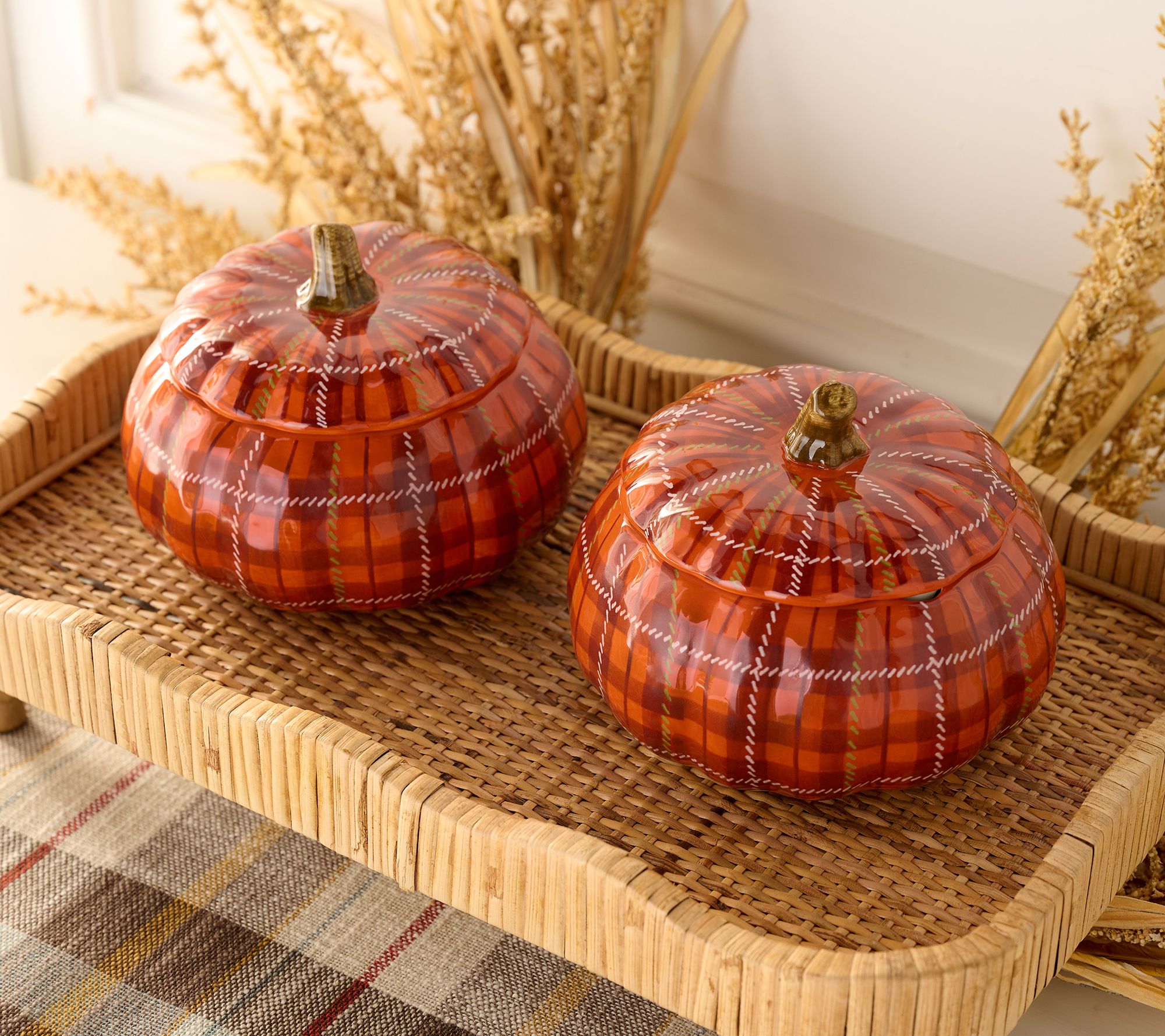 Set of 2 Ceramic Plaid Pumpkin Serving Bowls with Lid by Valerie