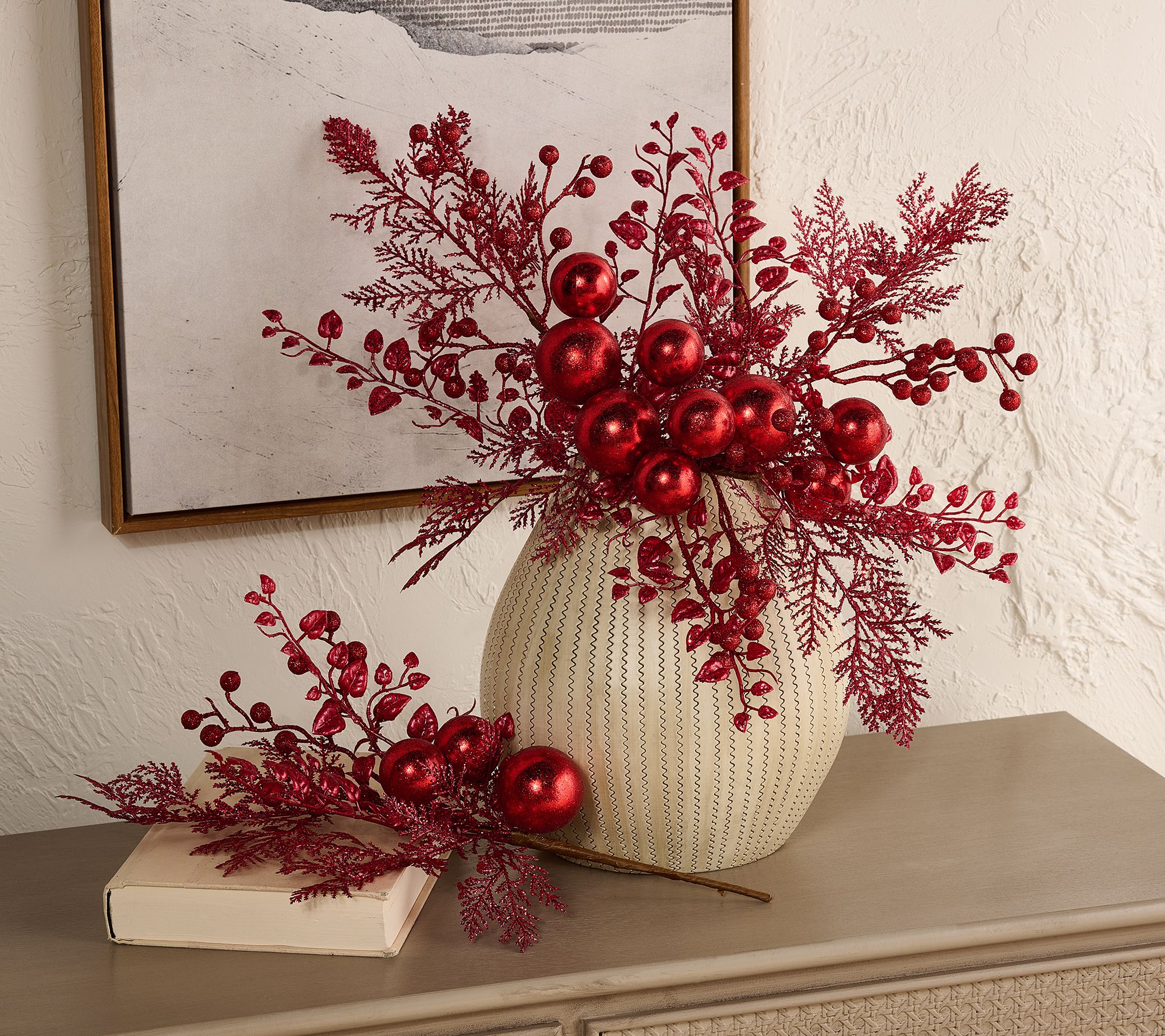 Merry & bright! Holiday tablescapes and mantelpieces come alive with these sparkling picks. Tuck them among garlands, wreaths, or centerpieces to highlight gatherings and add a playful mix of faux greenery, berries, and ornaments. Flexible wired stems make it simple to shape and style them for just the right look. From the Valerie Parr Hill Collection.