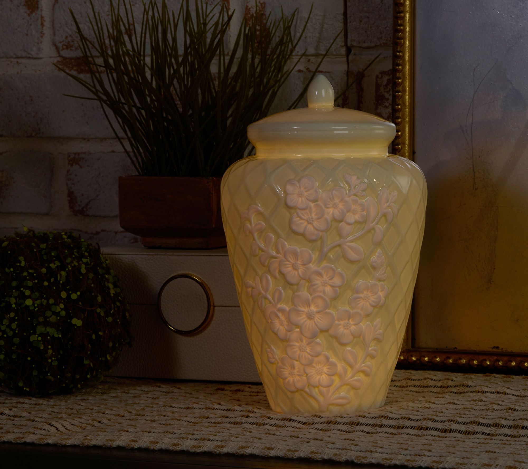 Soft illumination fills your room as this porcelain ginger jar glows gently from within, casting intricate shadows of its embossed floral and vine details. With the elegance of a bisque finish and delicate lattice texture, it creates a stylish focal point on a sideboard or mantel, especially when its set-it-and-forget-it timer lights up cozy evenings. From the Valerie Parr Hill Collection.
