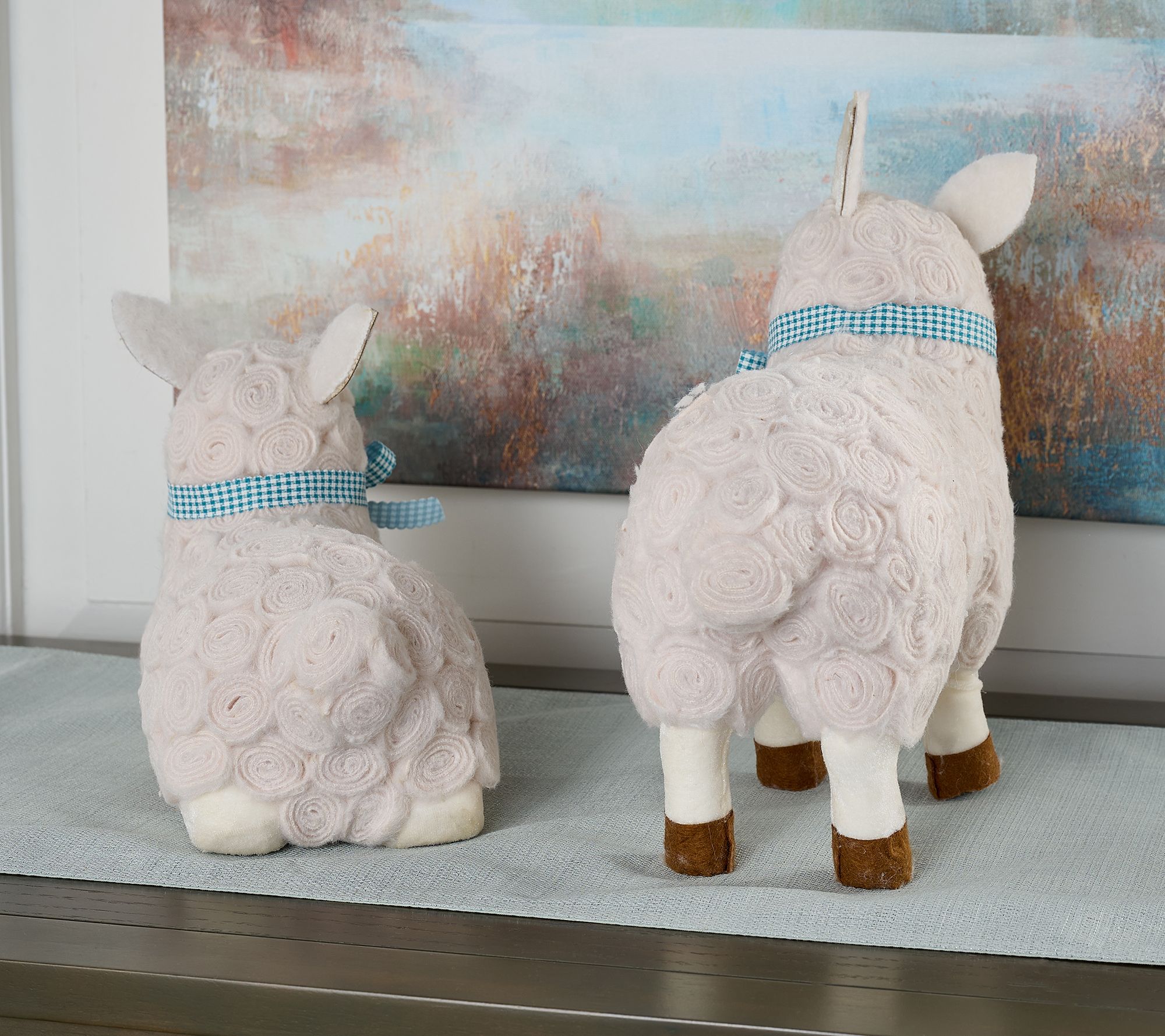 Transform your mantel or side table into a scene of springtime delight with this pair of fabric rosette lambs, each finished with a classic blue and white checked bow. The standing and laying lambs create a charming duo that brings pastoral warmth and a gentle pop of texture to your spring decor. From the Valerie Parr Hill Collection.