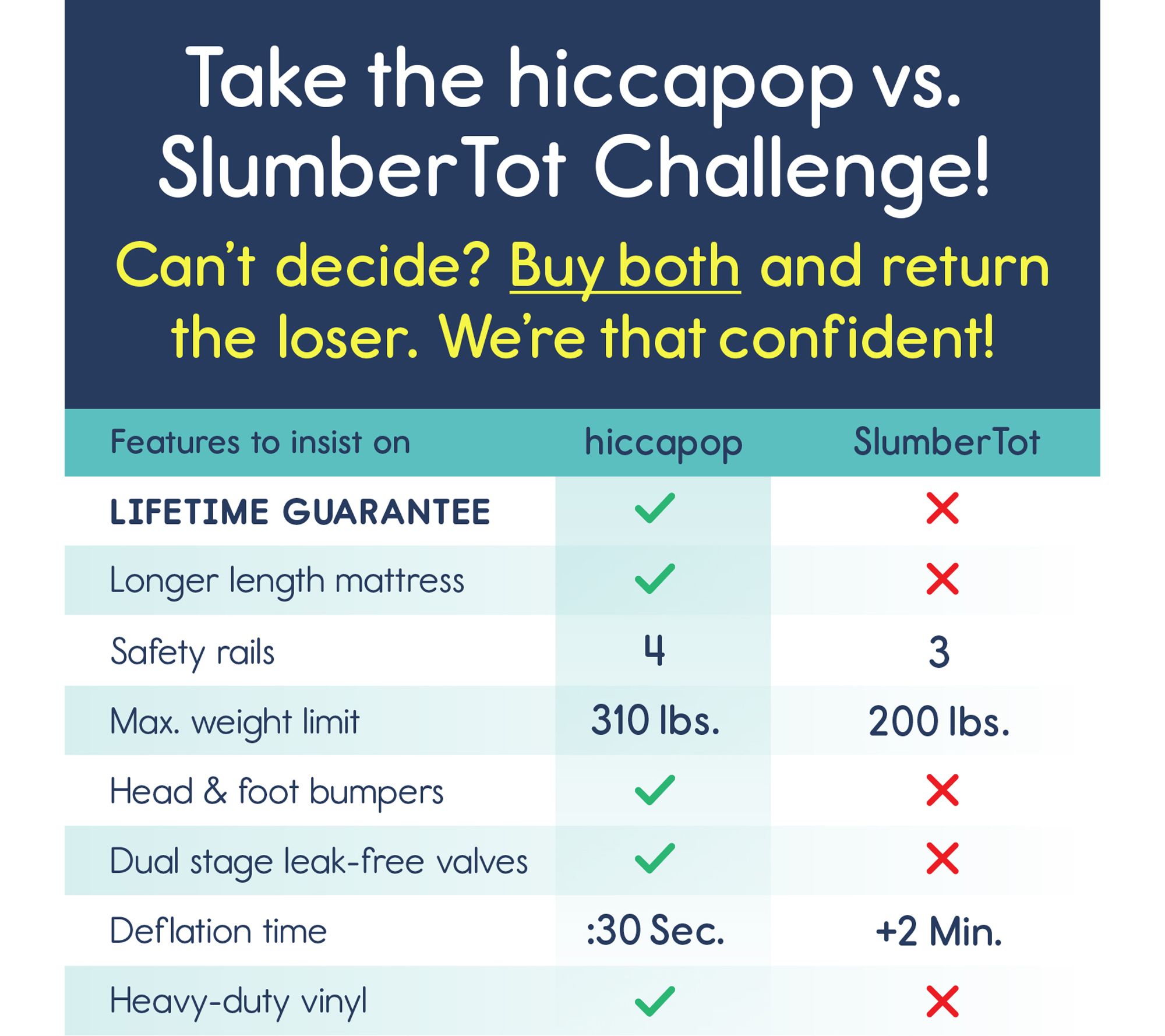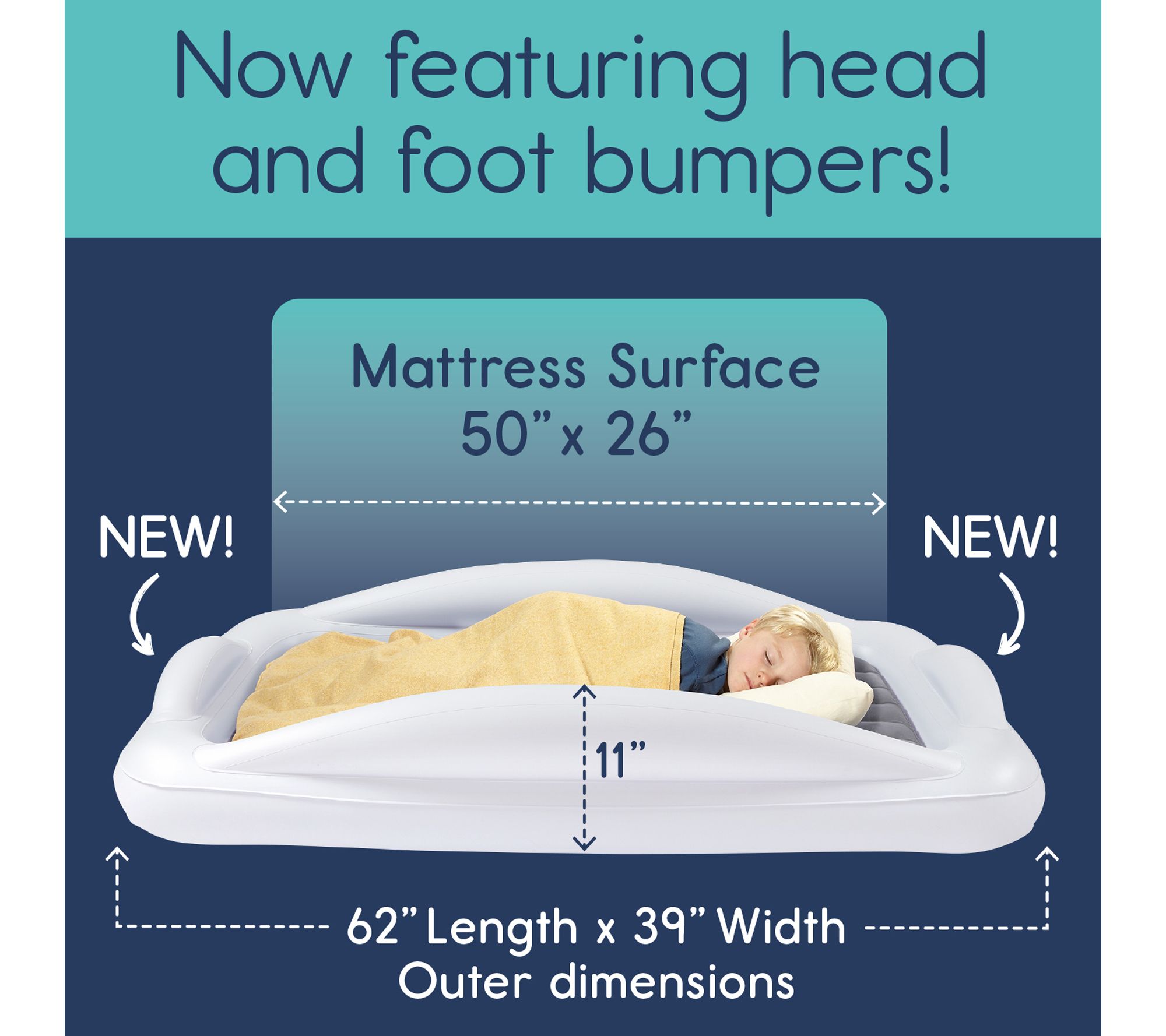 • Thick vinyl, reinforced seams, flocked mattress surface, extra-tall and extra-long built-in safety bumpers, inflates in under 30 seconds, quick-release valve for effortless deflation, fits all standard crib sheets