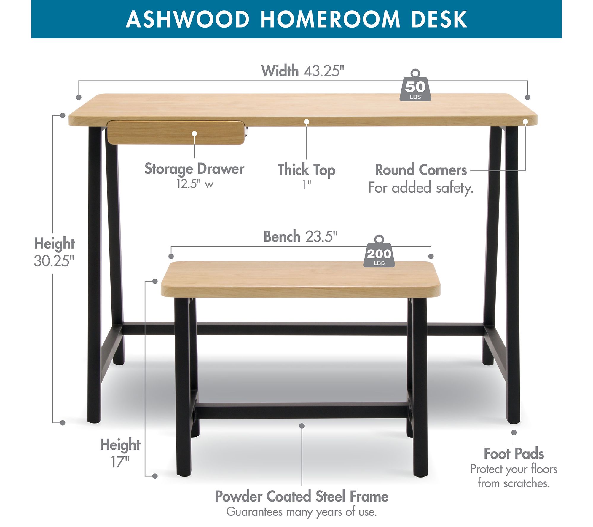 • Measurements: Desk 43.25"W x 19.75"D x 30.25"H, supports up to 50 lbs; Drawer 12.5"W; Bench 23.5"W