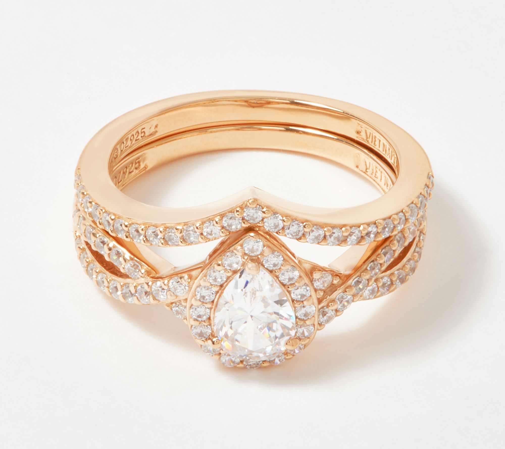 Diamonique Pear Halo Ring & Pointed Guard Set, Sterling