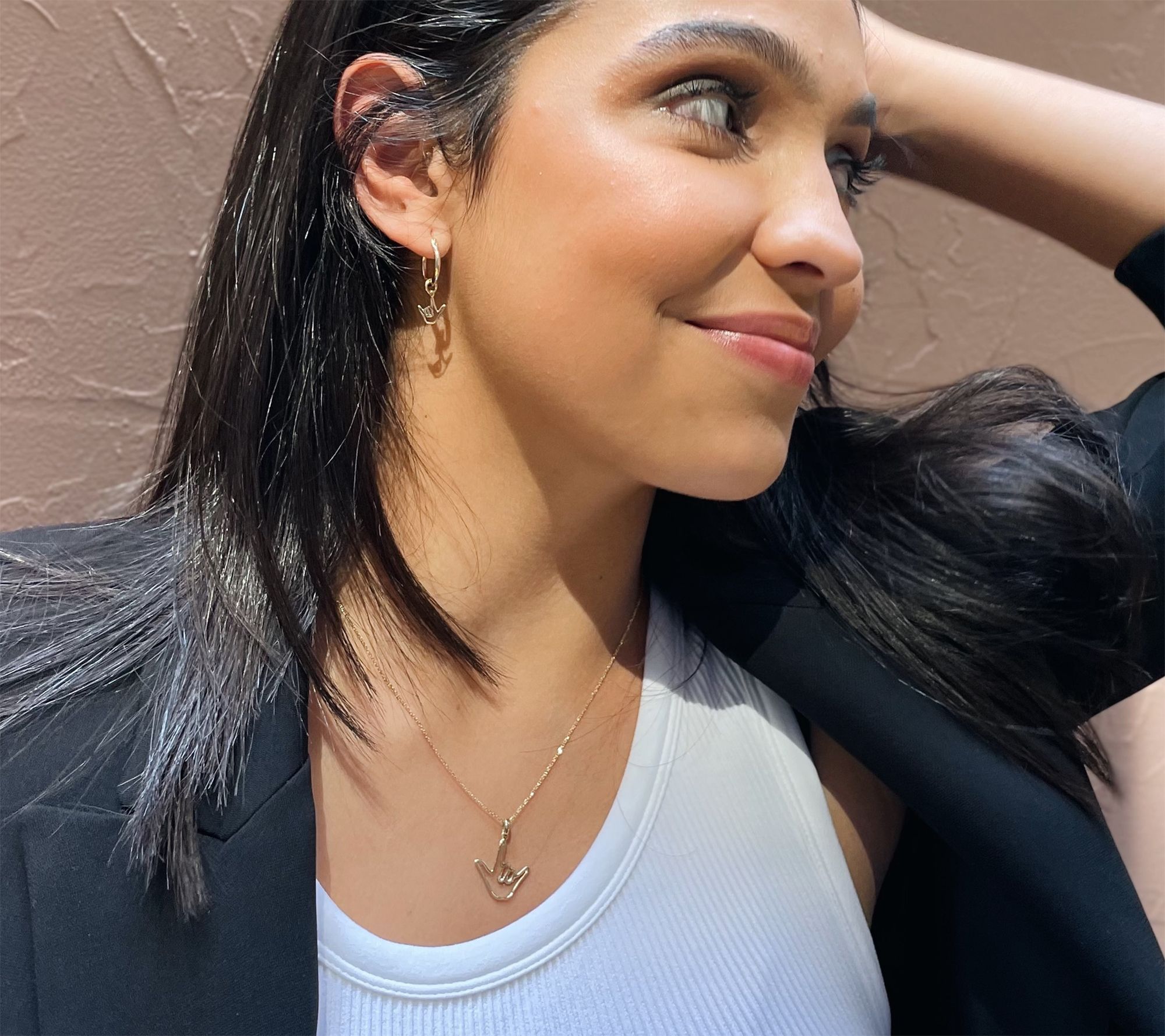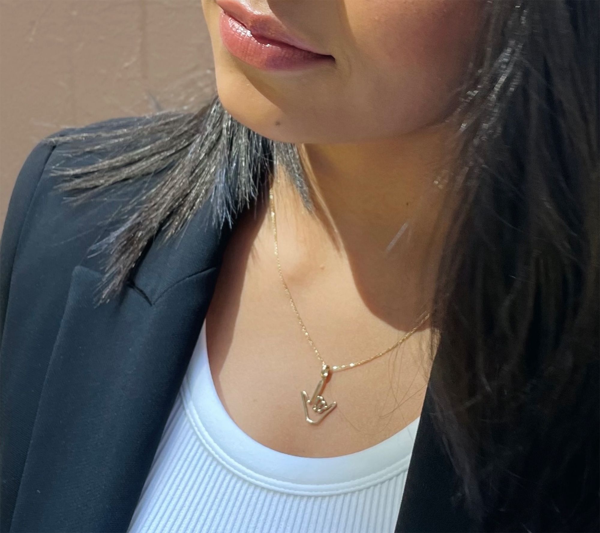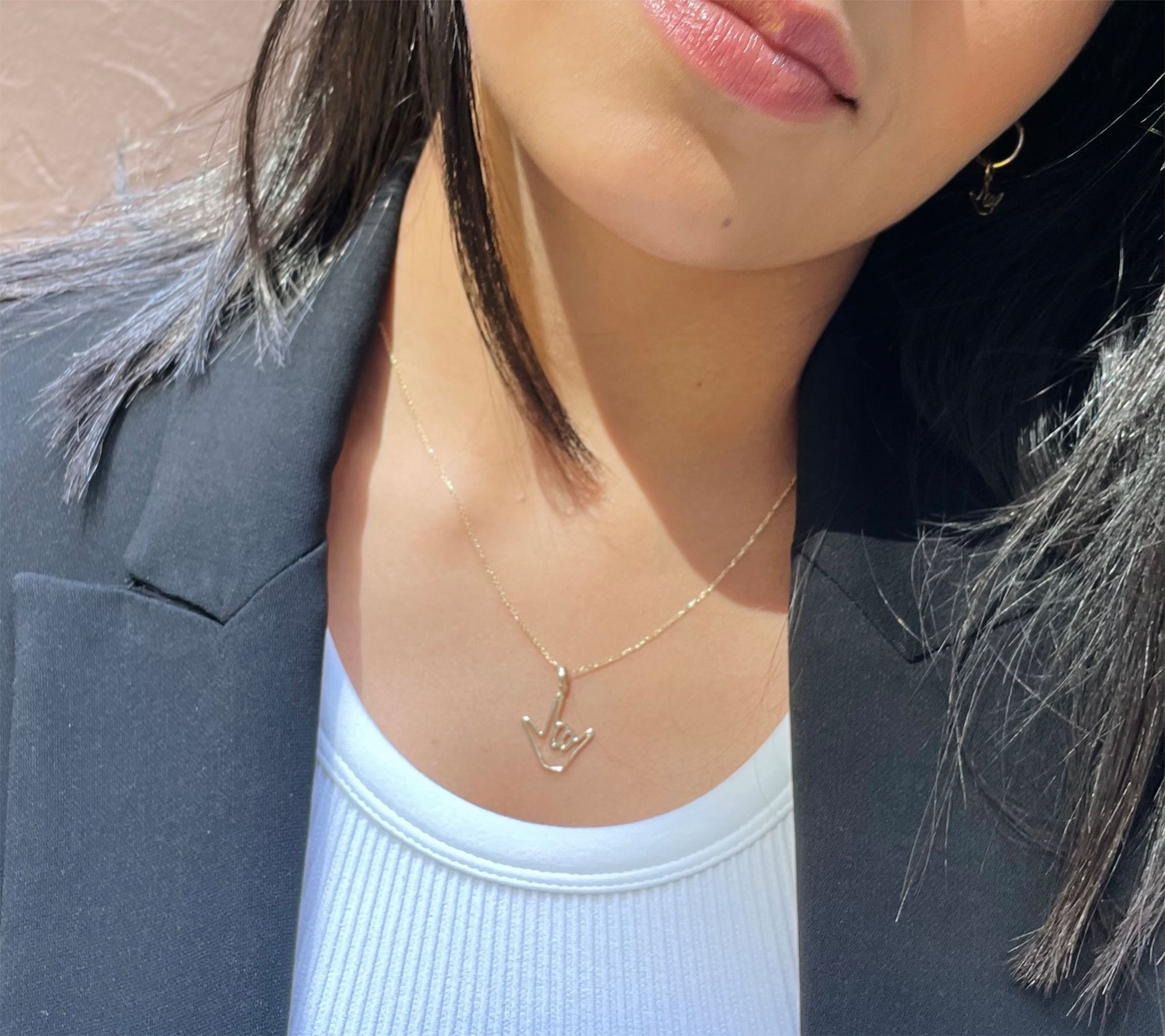 A heartfelt style statement, this pendant necklace expresses "I love you" in American Sign language. The polished hand symbol dangles from a shimmering diamond-cut chain. From RoseBYANDER.