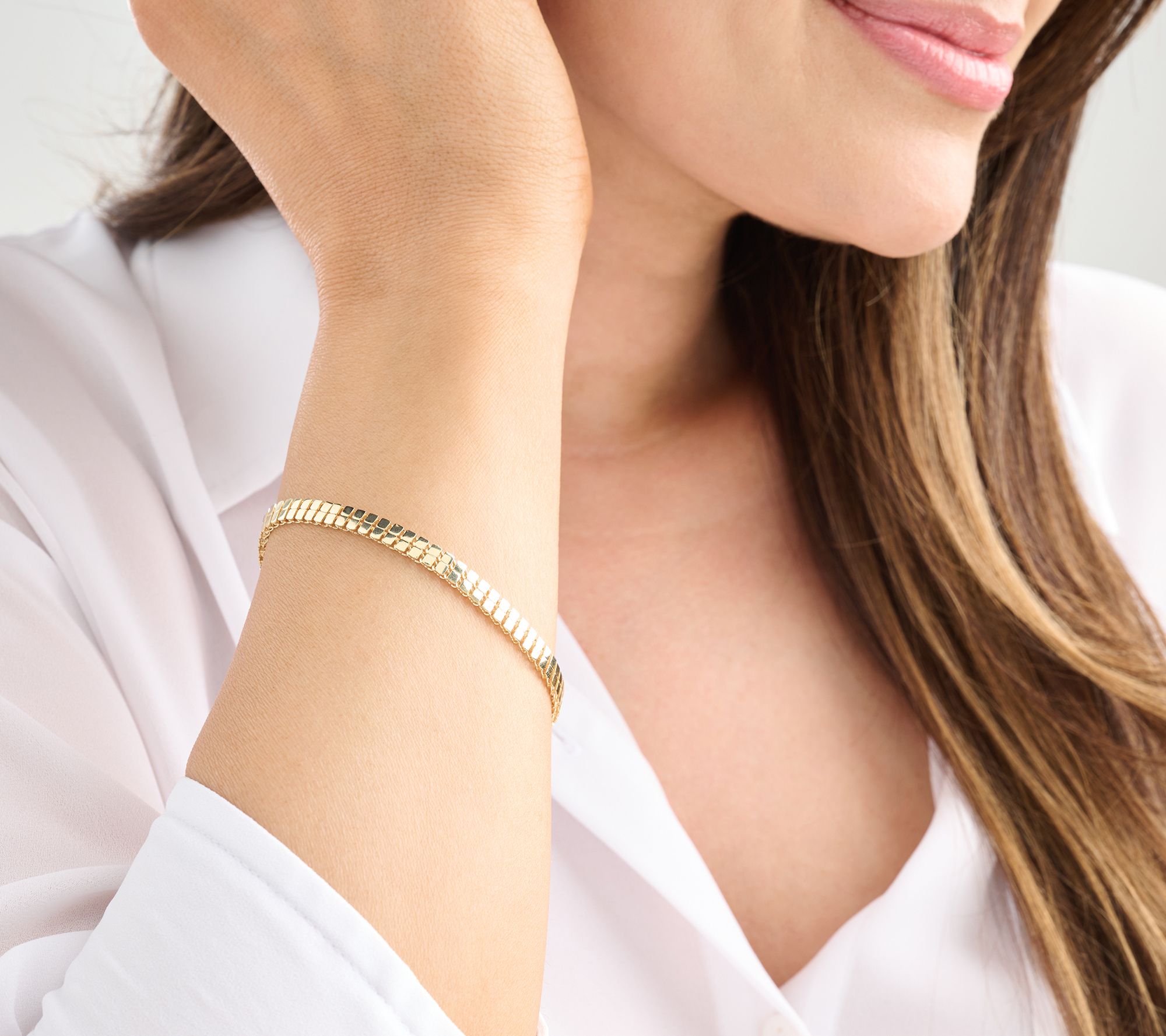 Prepare for impact! With shiny links of 14K gold all lined up in a slinky row, this need-now bracelet never gets lost in the other elements of your look. From Adorna.