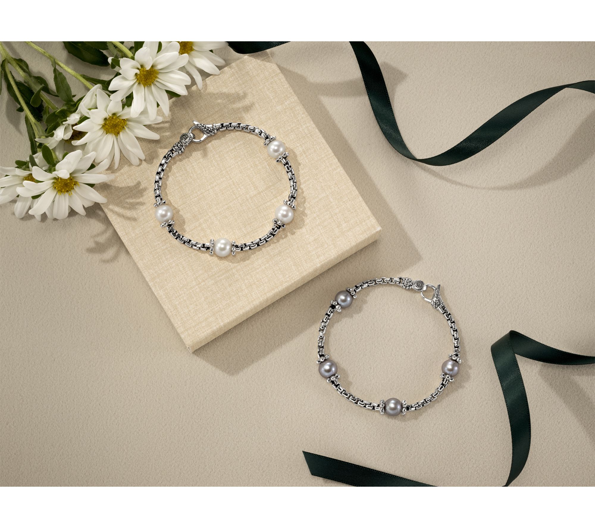 Graceful stations of gray cultured freshwater pearls dance along this sterling silver bracelet, lending refined radiance to your look. The polished box chain and intricate basketweave accents offer timeless style, whether your day calls for a little extra glow or you're celebrating a memorable moment. From JAI.