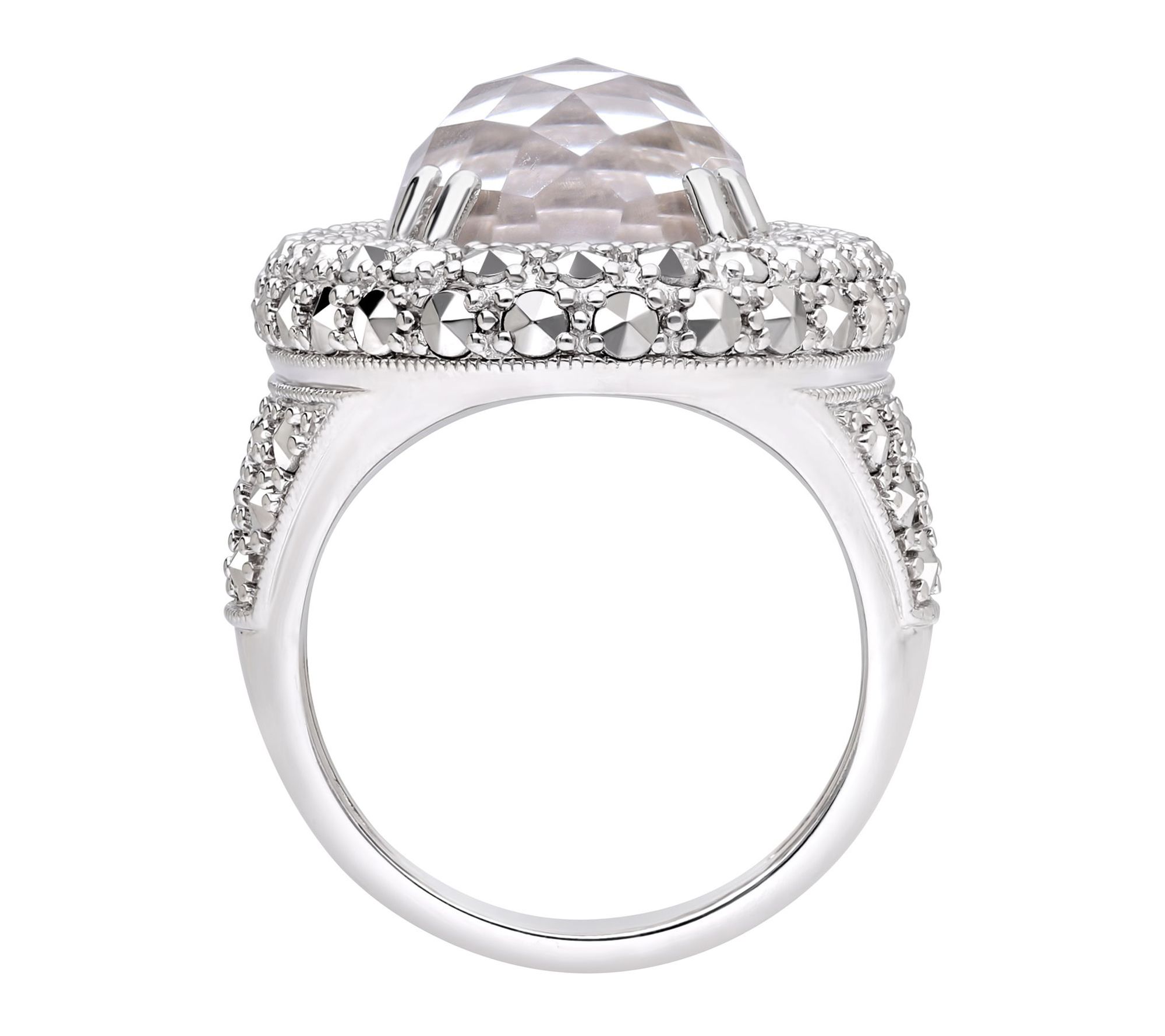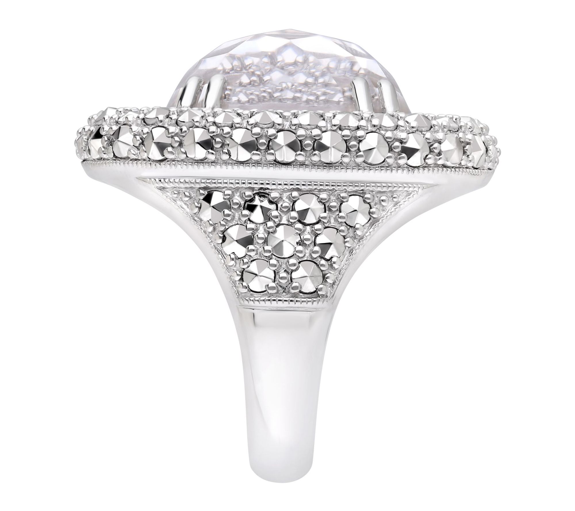 Show off vintage-inspired elegance with this sterling silver ring. Whether you're adding sparkle to your favorite black dress or elevating casual looks, the combination of chrome marcasite and quartz creates a striking statement piece that catches the light with every move. From Dallas Prince.