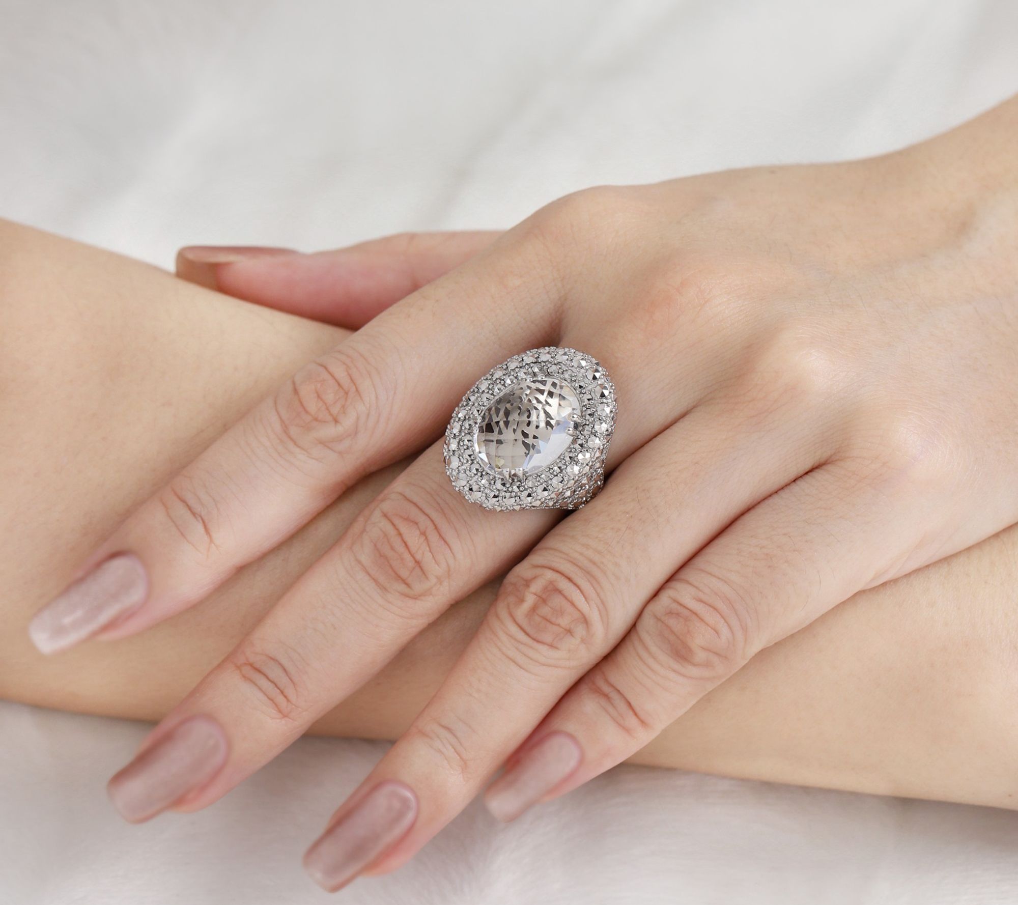 Oval, faceted, prong-set clear quartz gemstone; halo of round, pave-set chrome marcasite gemstones with intricate detailing; polished finish