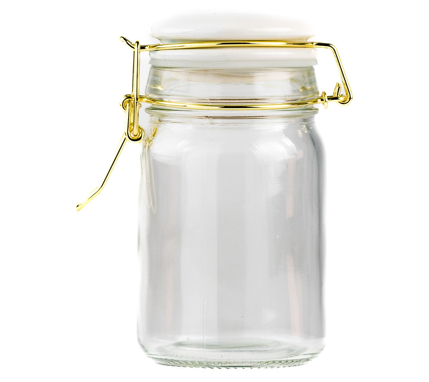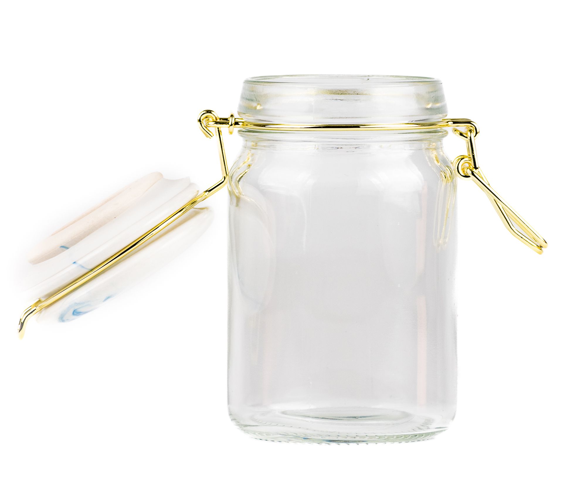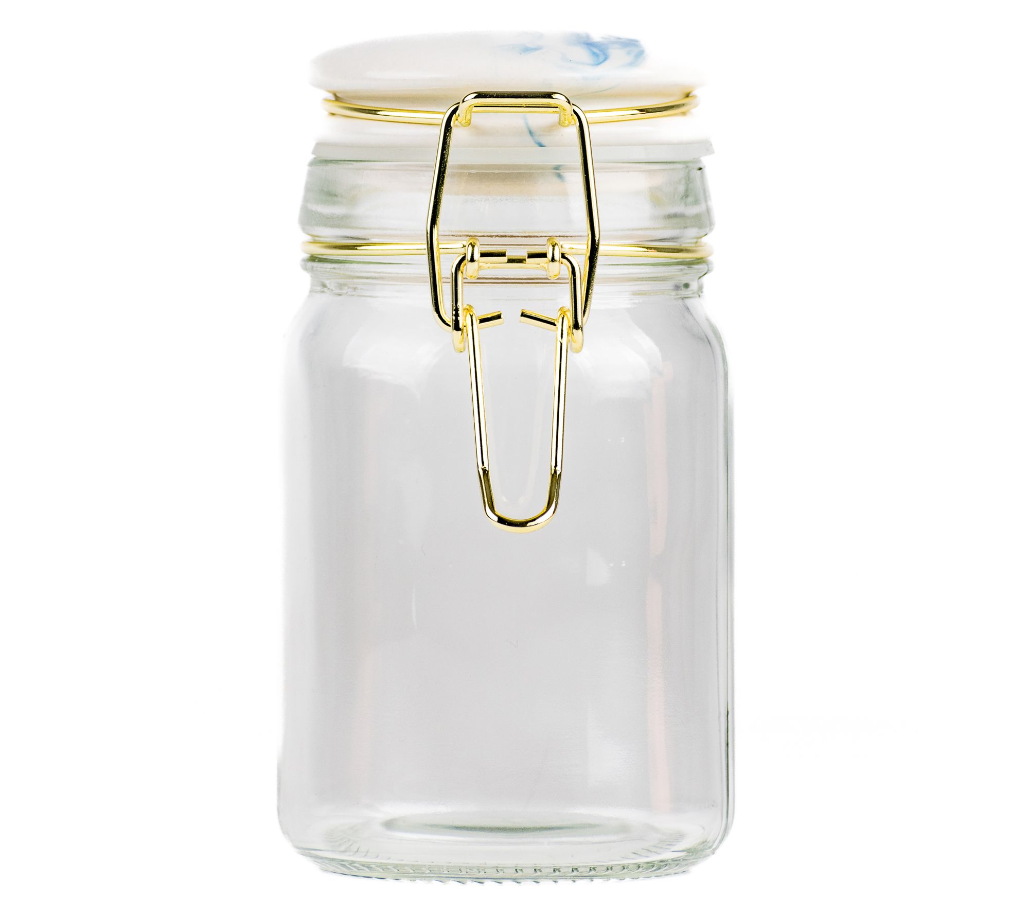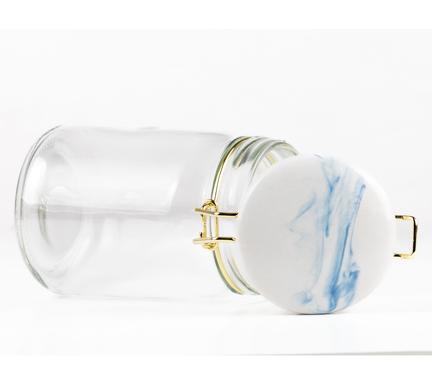 • Soda lime glass construction; white ceramic lids with cobalt blue marbled effect
