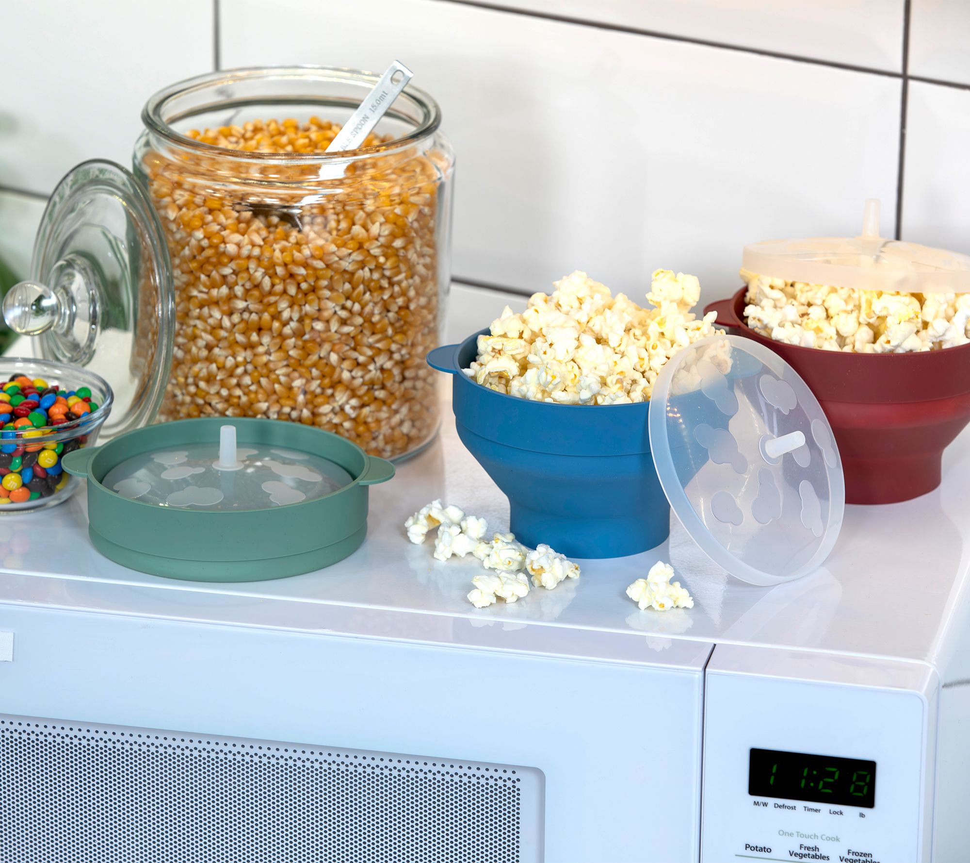 • Includes three mini silicone popcorn poppers with lids
