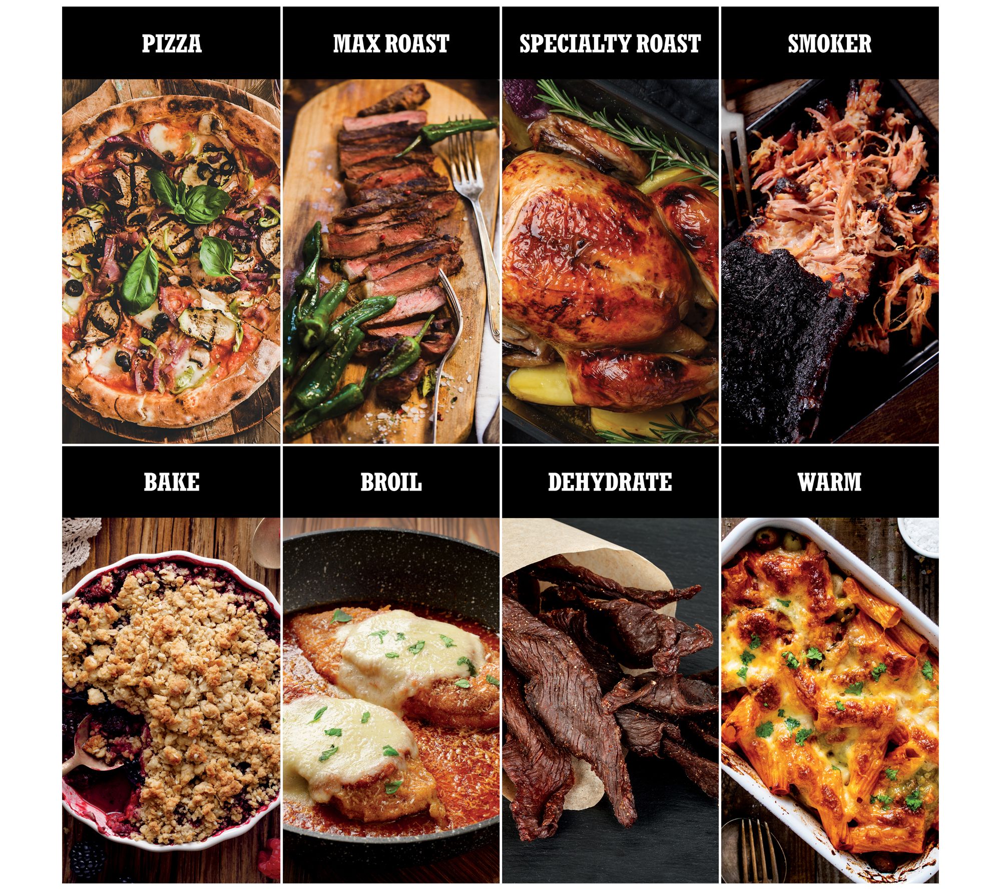 • Eight functions: pizza, max roast, specialty roast, broil, bake, smoker, dehydrate, and keep warm
