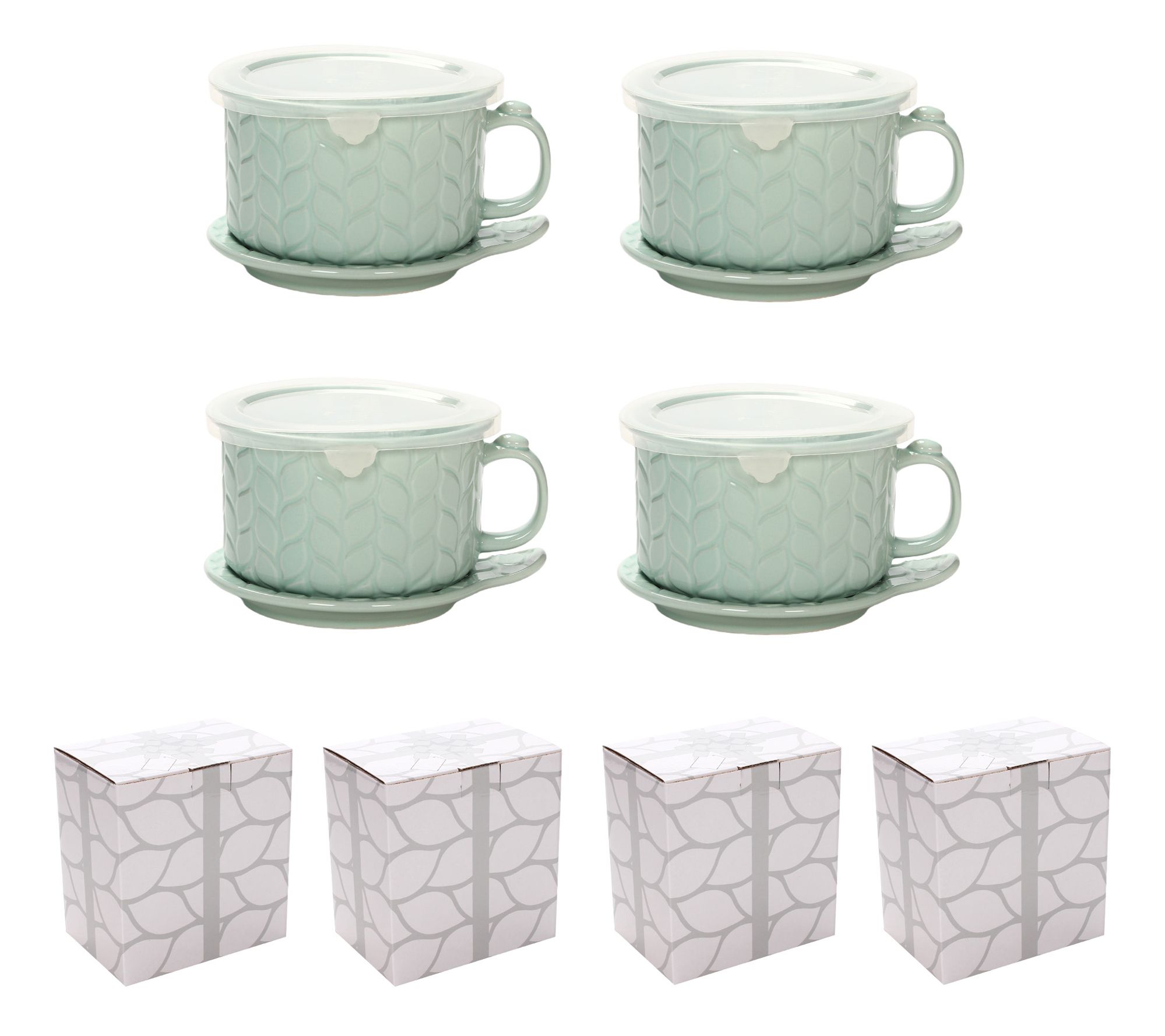 Includes four 25-oz soup mugs, four Lid-Its, four plastic snap-on storage covers, and four gift boxes