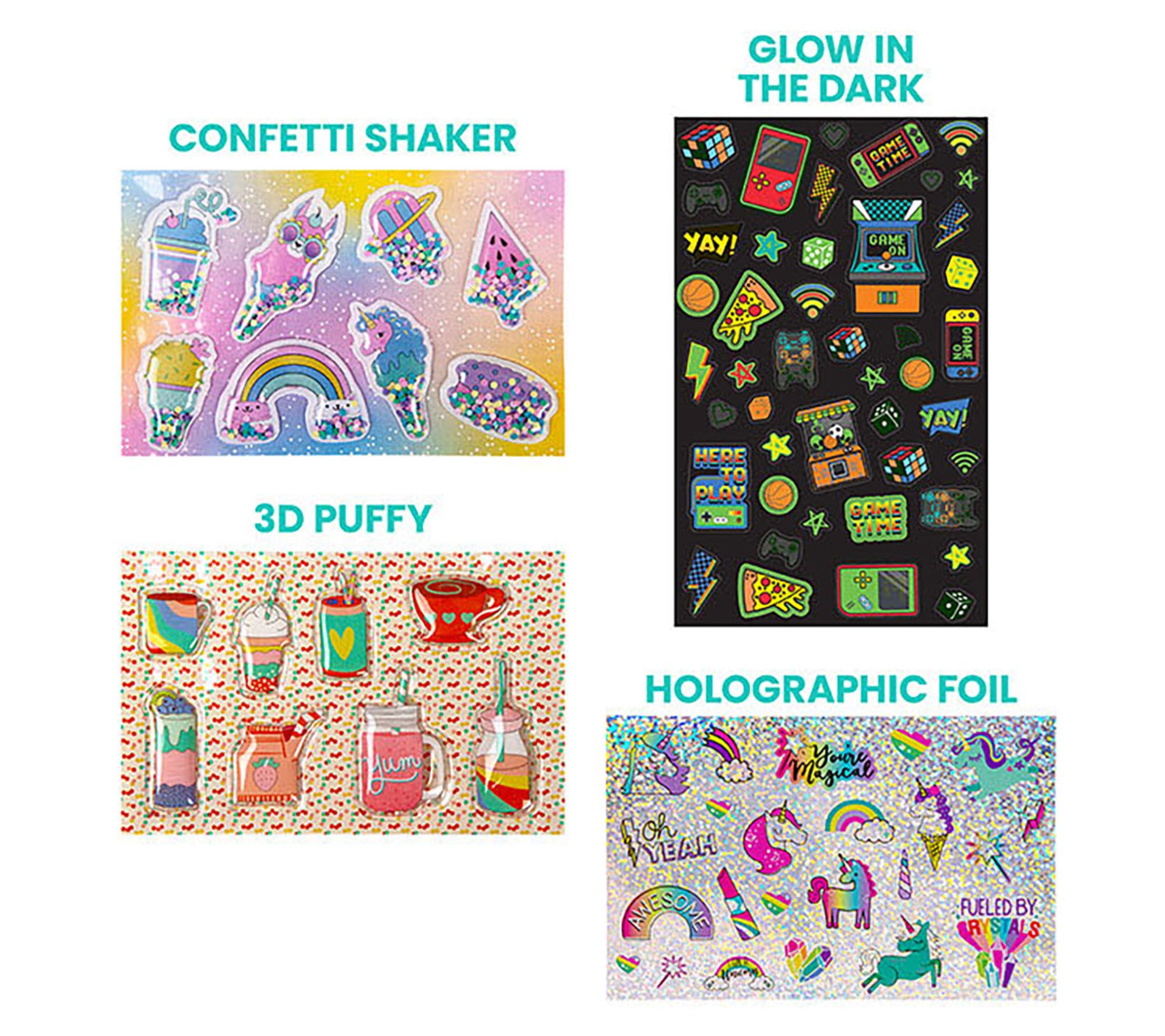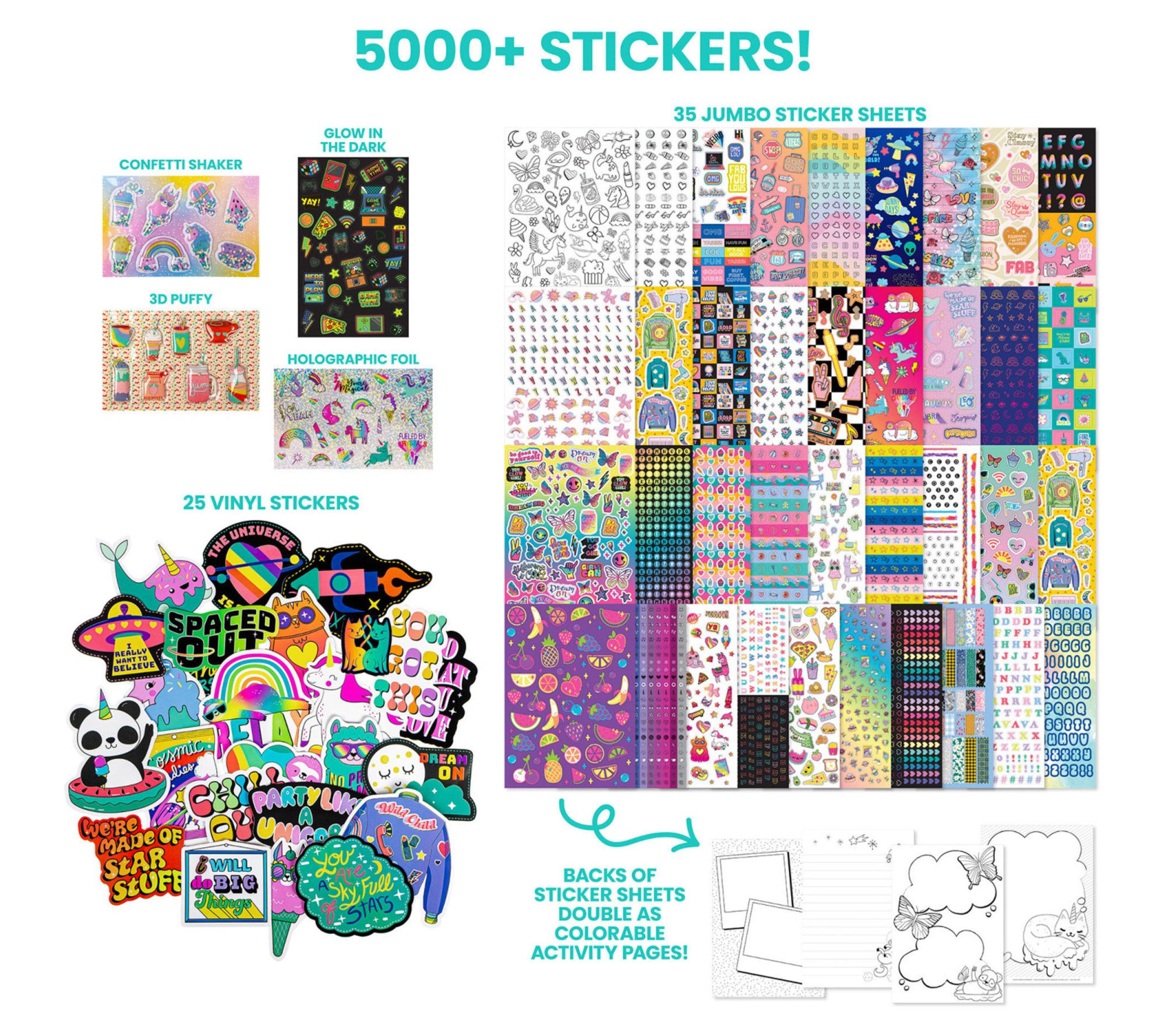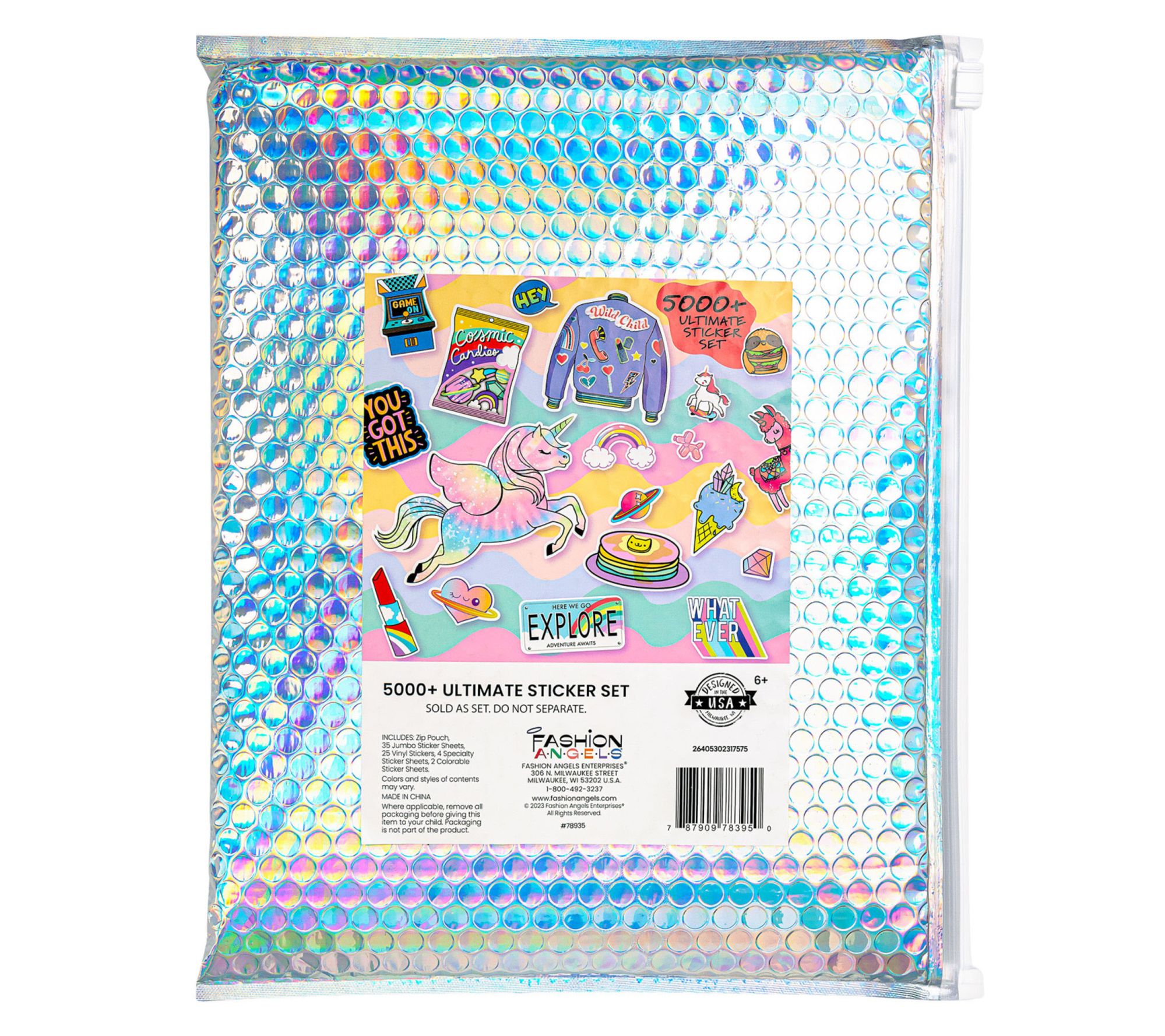 Overflowing with over 5,000 stickers -- including glow-in-the-dark, holographic foil, and 3D-puffy styles -- this ultimate sticker set provides endless creative options for decorating water bottles, notebooks, and greeting cards alike. A chic pouch and a sticker album keep every design organized while colorable pages add extra fun to every crafting session. From Fashion Angels.