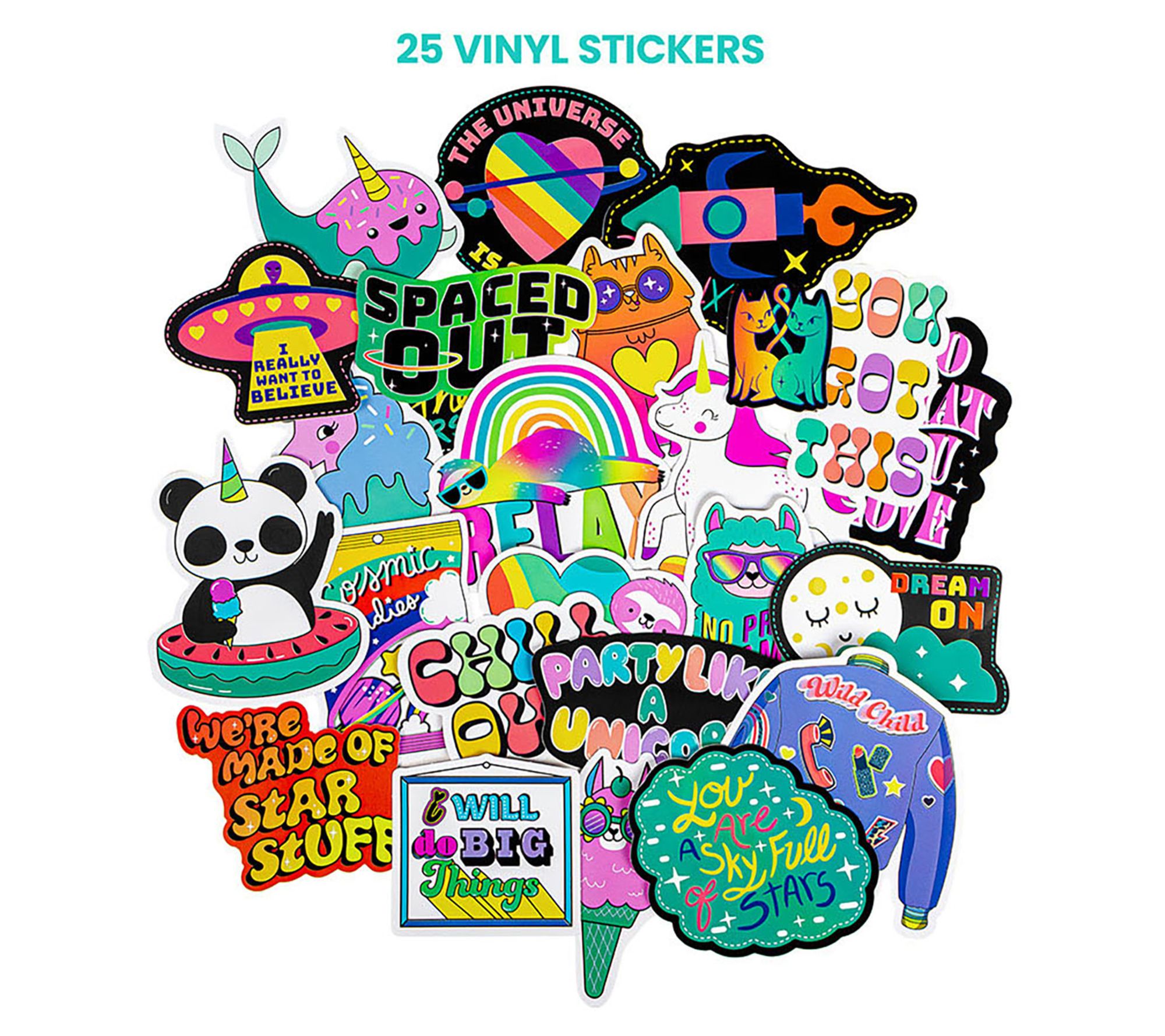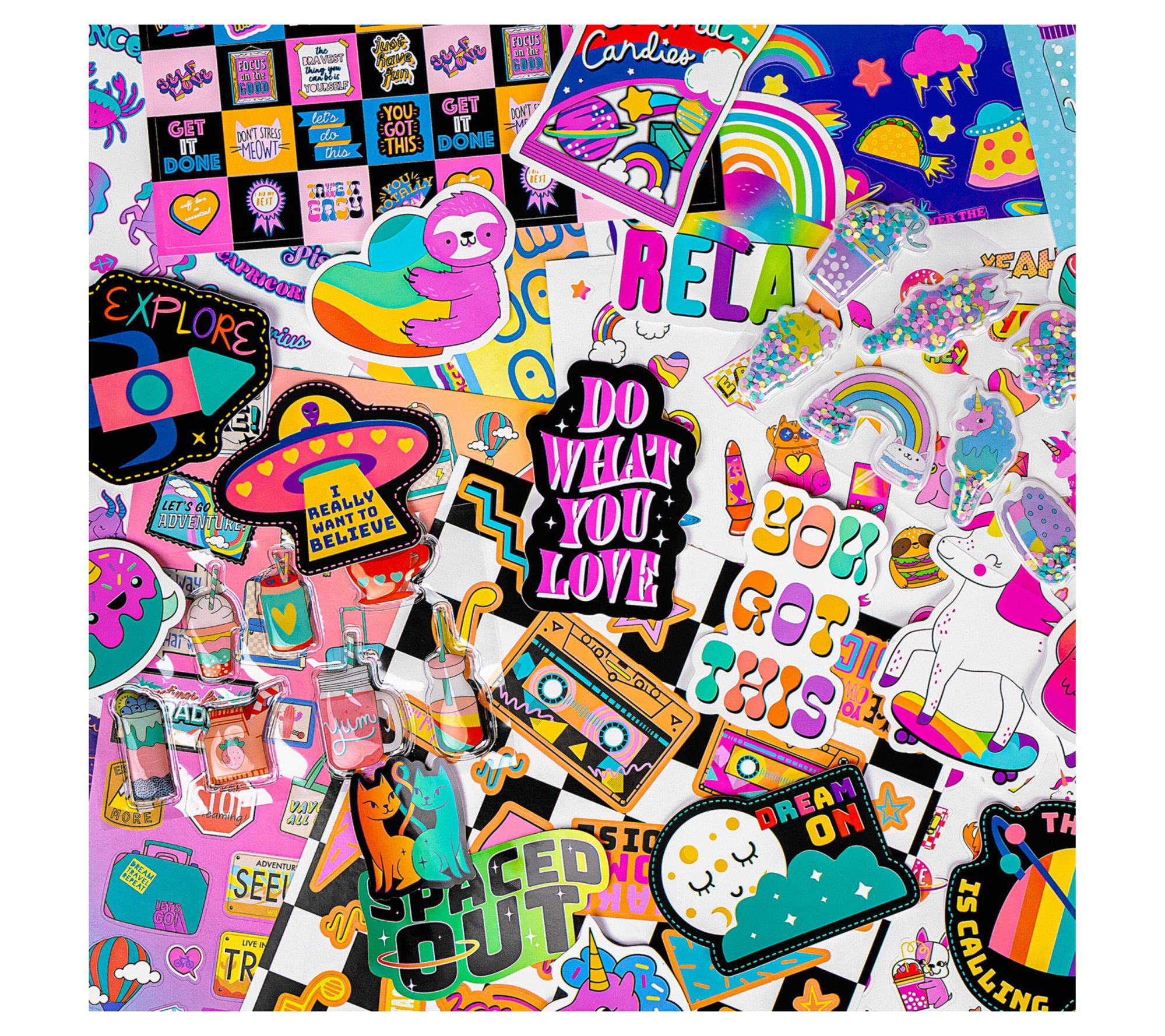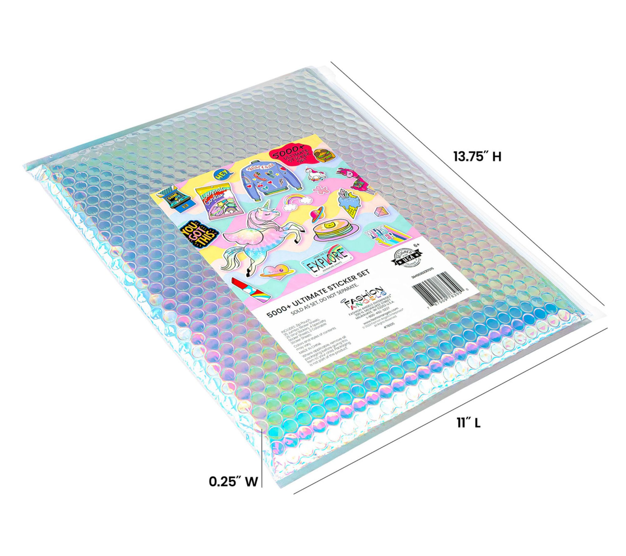 Overflowing with over 5,000 stickers -- including glow-in-the-dark, holographic foil, and 3D-puffy styles -- this ultimate sticker set provides endless creative options for decorating water bottles, notebooks, and greeting cards alike. A chic pouch and a sticker album keep every design organized while colorable pages add extra fun to every crafting session. From Fashion Angels.