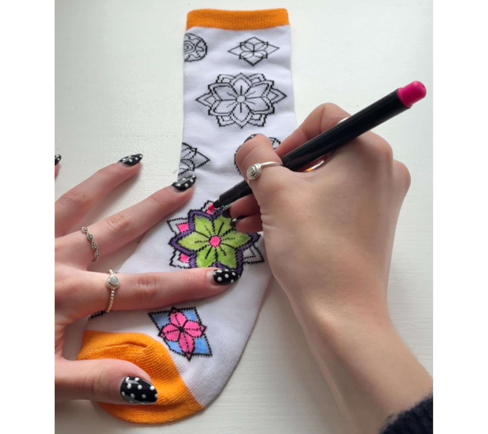 • Includes three pairs of socks and five fabric markers