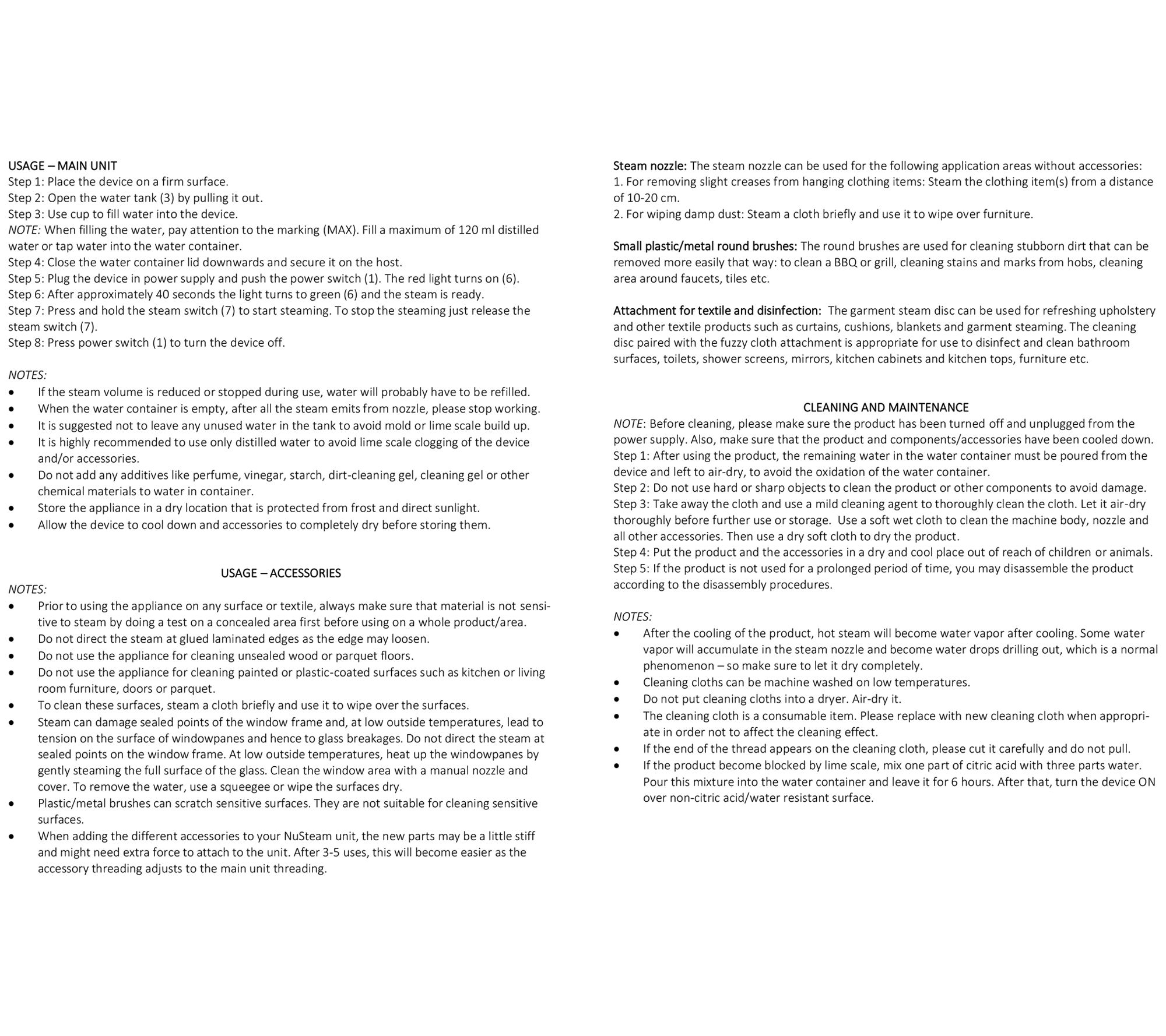 • Includes steamer, attachment adapter, round brush, cleaning disc, concentrator nozzle, metal brush, rectangular brush, garment/upholstery disc, fuzzy cloth, and cup