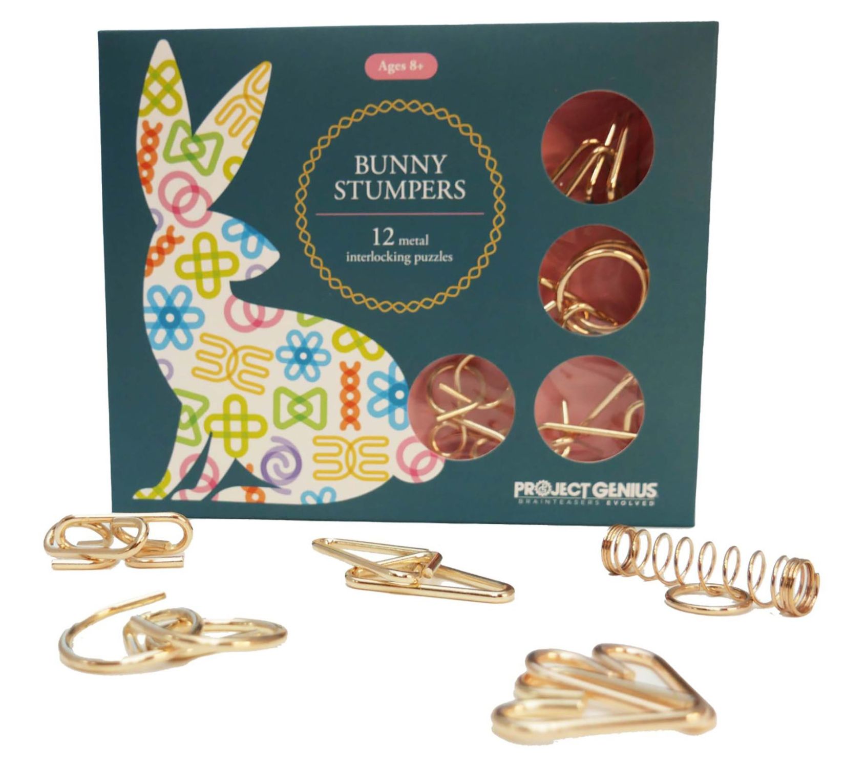 Hop into fun when you have this set of 12 interlocking bunny puzzles, featuring intriguing designs and varying difficulty levels that provide hours of challenging excitement. From Project Genius.