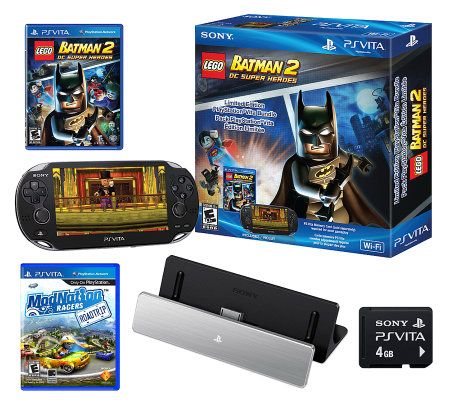 Includes PS Vita console, Lego Batman 2: DC Superheroes game, ModNation Racers: Road Trip game, 4GB PS Vita memory card, PS Vita cradle, AC adapter, and AC power cord