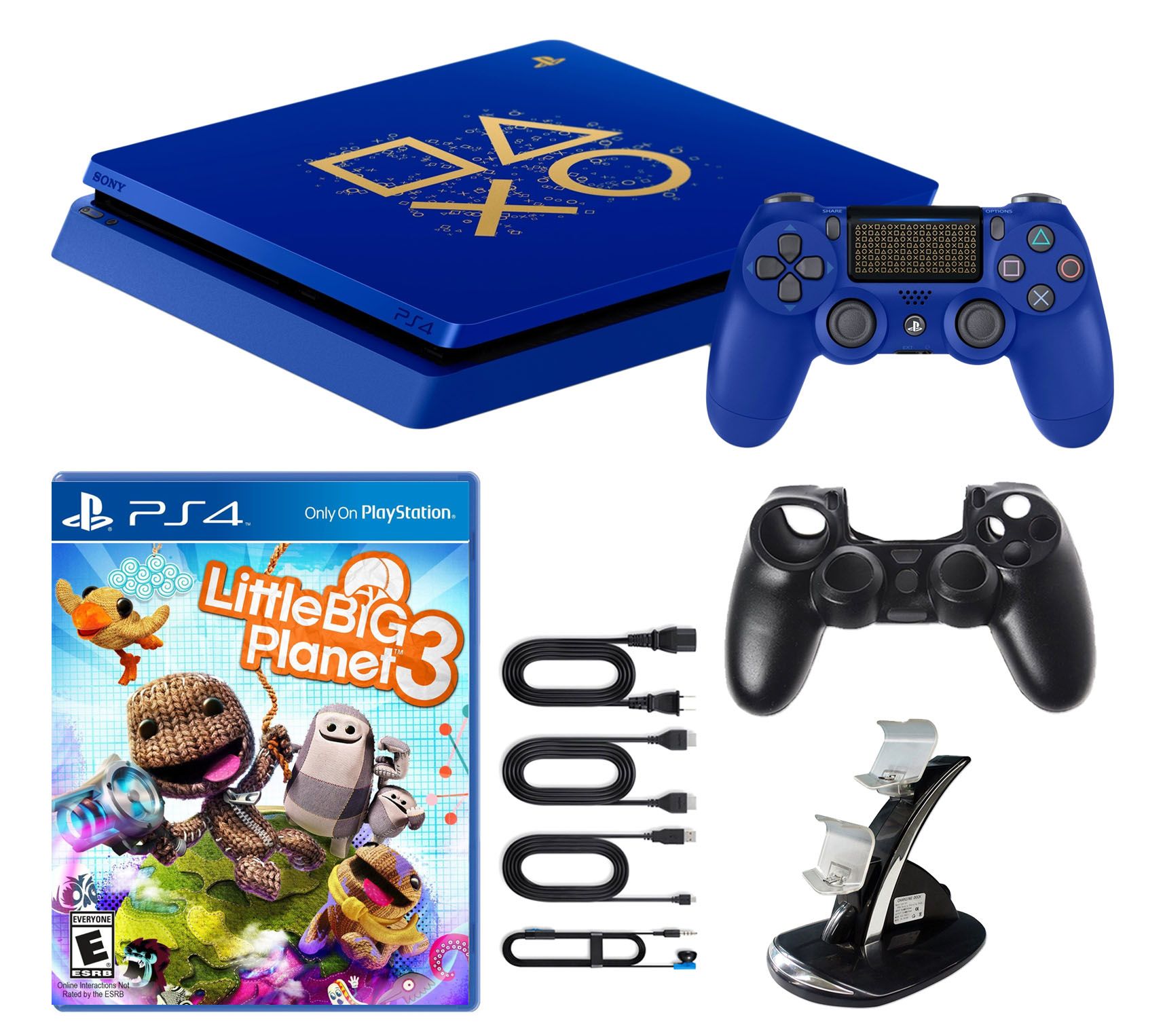 Includes PlayStation 4 Special Edition Days of Play Slim console with Special Edition DualShock 4 wireless controller, USB charging cable, mono headset, HDMI cable, and AC power cord; LittleBigPlanet 3, dual-dock charging cradle, and silicone controller sleeve
