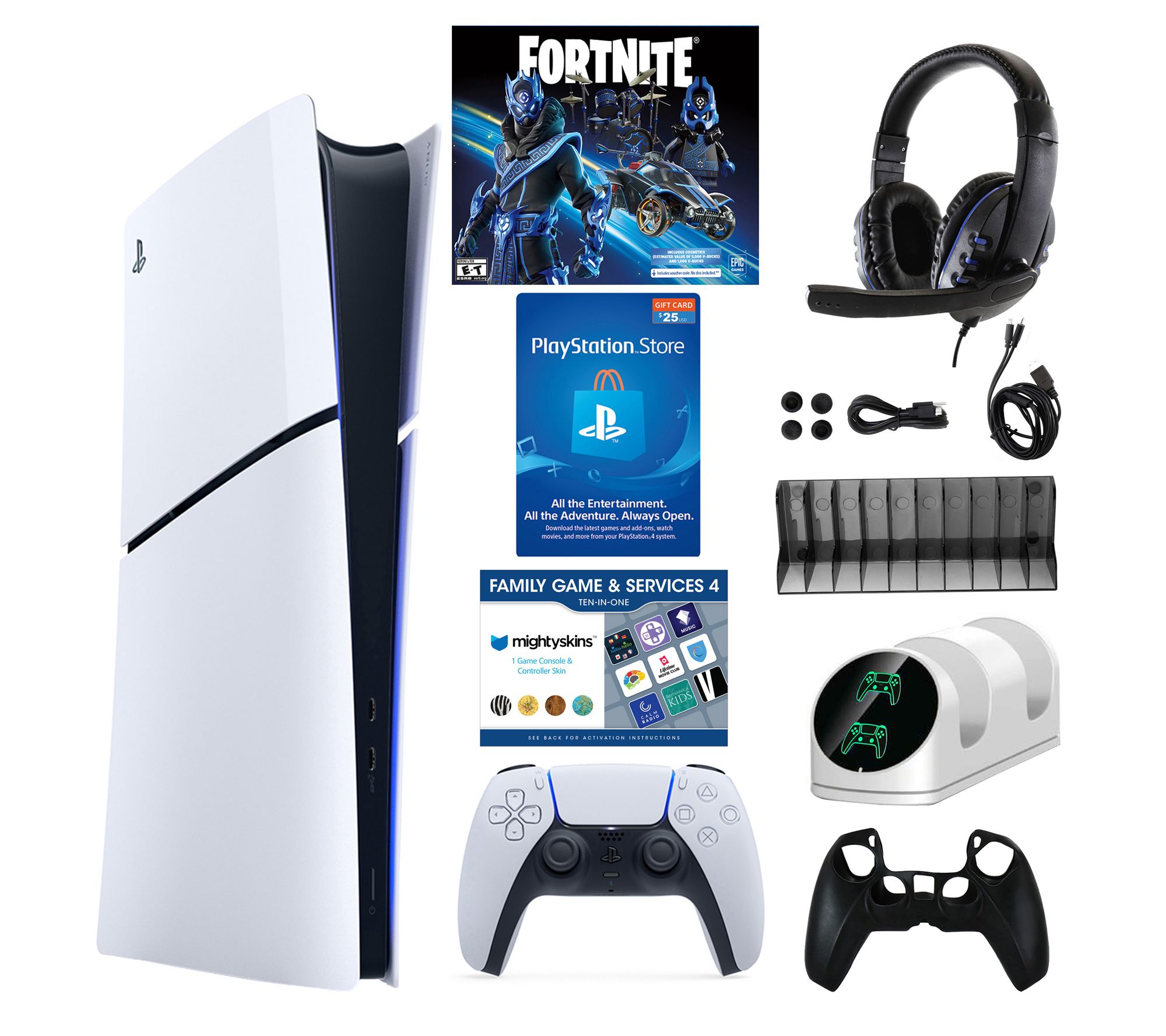 Includes PS5 Slim digital console, DualSense wireless controller, power cord, HDMI cable, and micro-USB charging cable; Fortnite Cobalt Star accessories bundle download, dual charging dock, wired headset, silicone case, storage stand, USB-C cable, 2-in-1 USB- cable, four thumb grips, and $25 PSN card