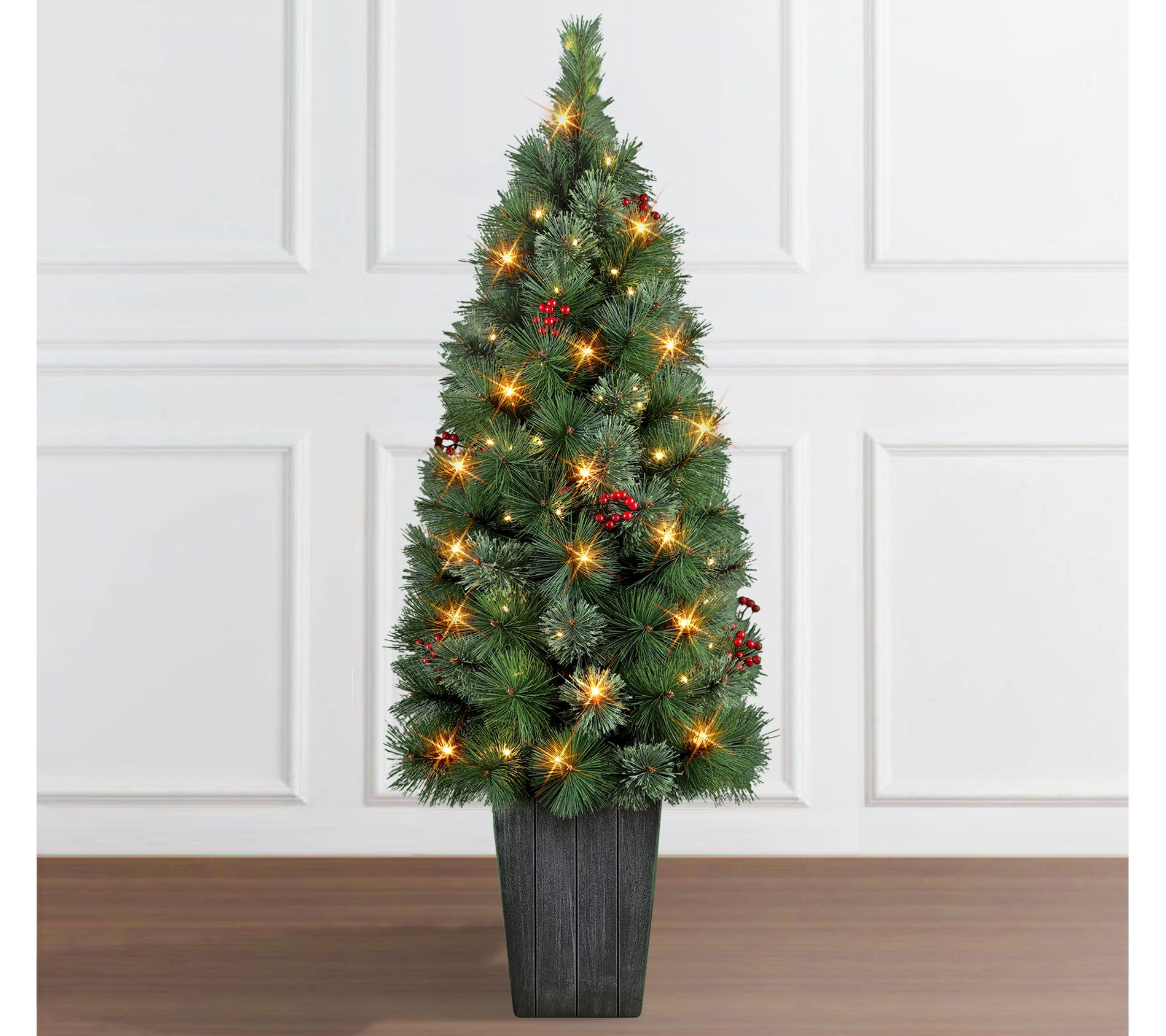 Bring on the merriment wherever you place this pretty potted tree. It features lifelike pine branches and a bevy of lights to add a little sparkle. All it needs is some of your favorite decorations to be ready for Santa's arrival. From Puleo International.