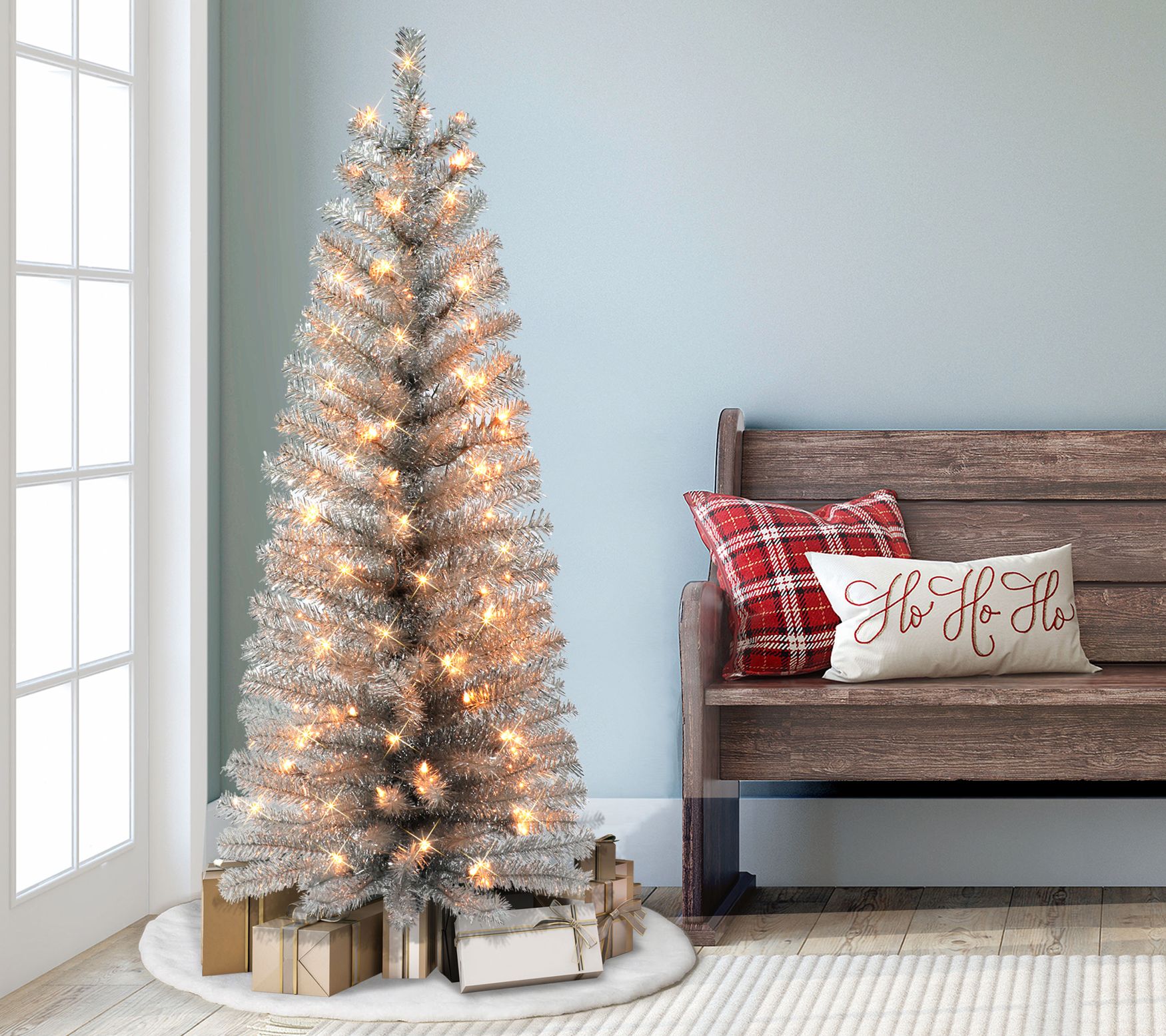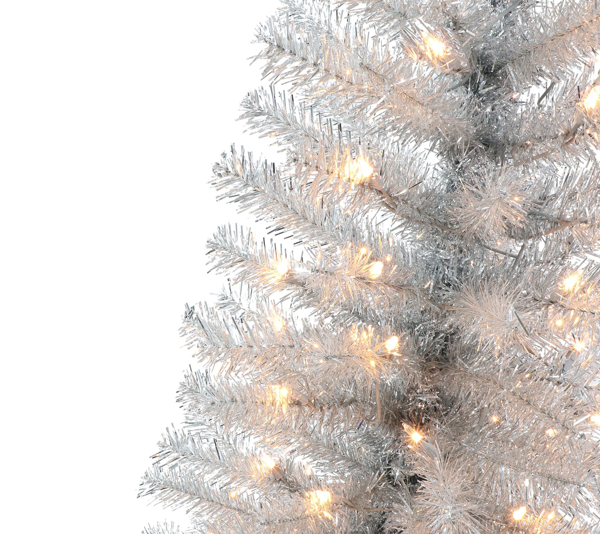 Save time while prepping your home for the holidays by setting up this elegant silver tree pre-decorated with festive lights. From Puleo International.