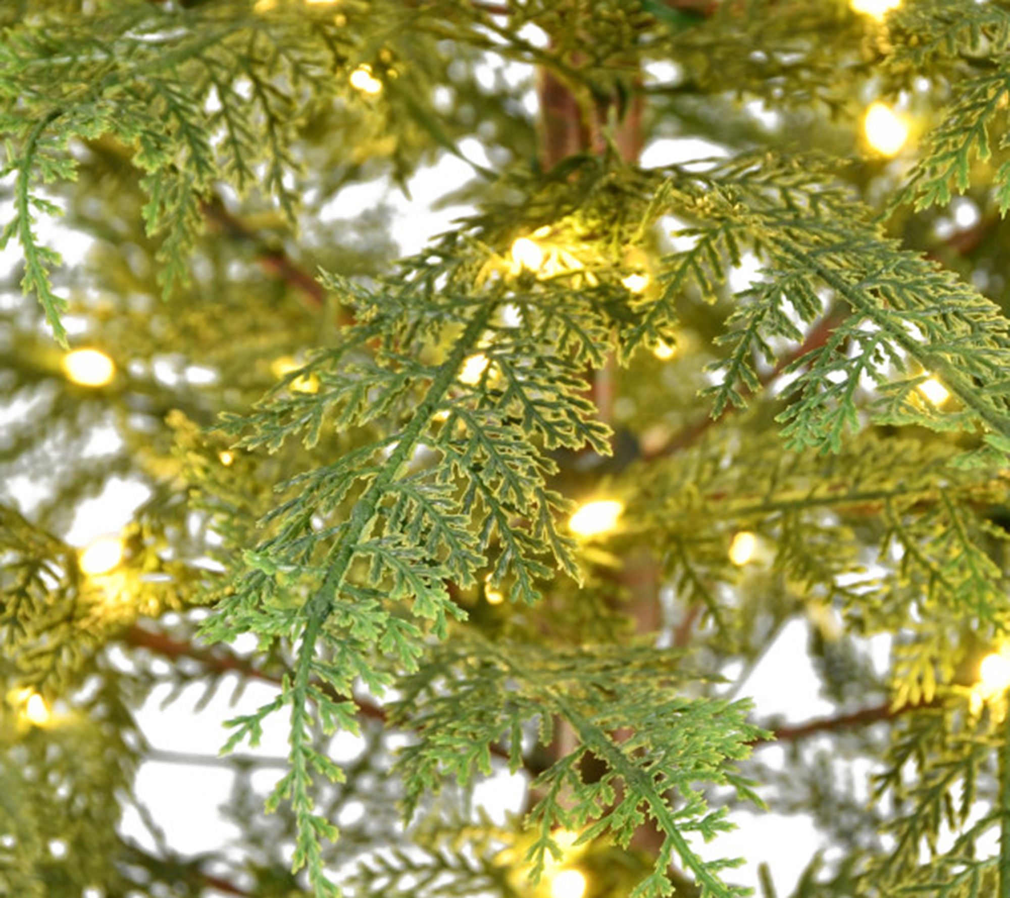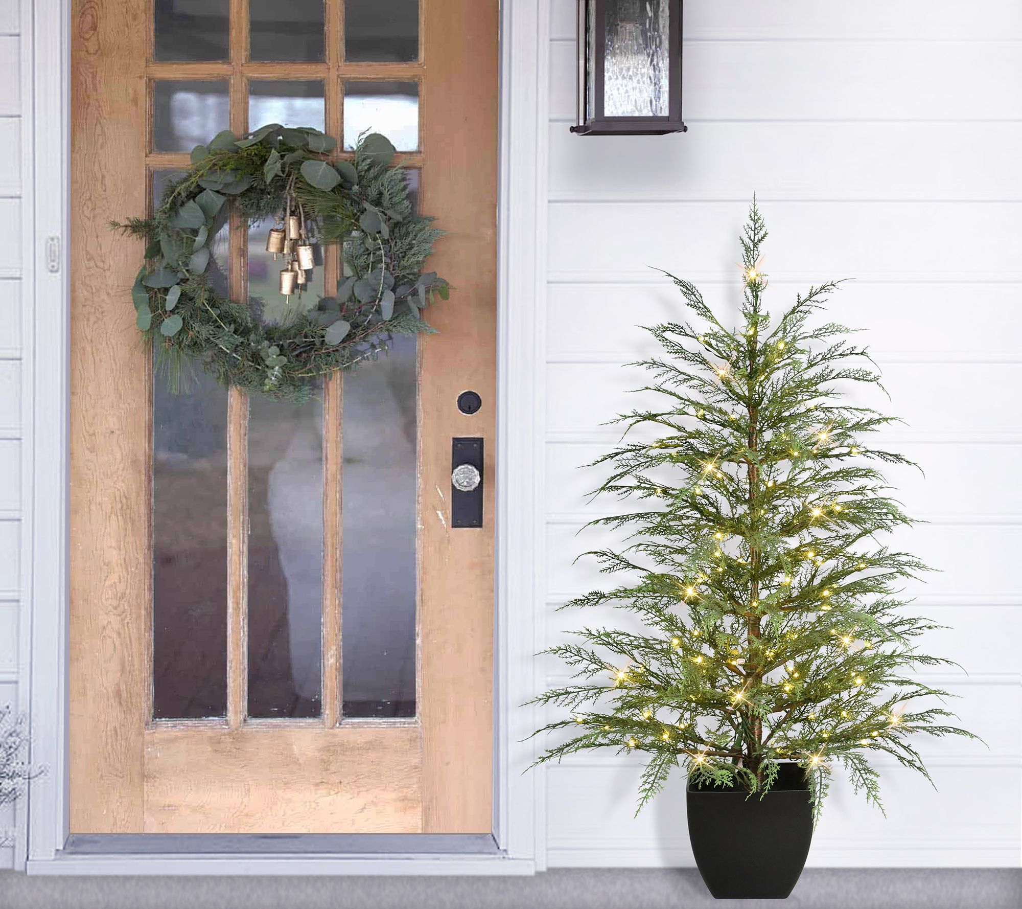 Bring the holiday spirit into your home with this pre-lit potted Mountain Cedar faux Christmas tree. This artificial tree stands out with its 100 warm white LED rice Lights, offering a festive glow without the hassle of stringing bulbs. Its easy assembly and sturdy decorative pot make it a hassle-free addition to your holiday decor. From Puleo International.
