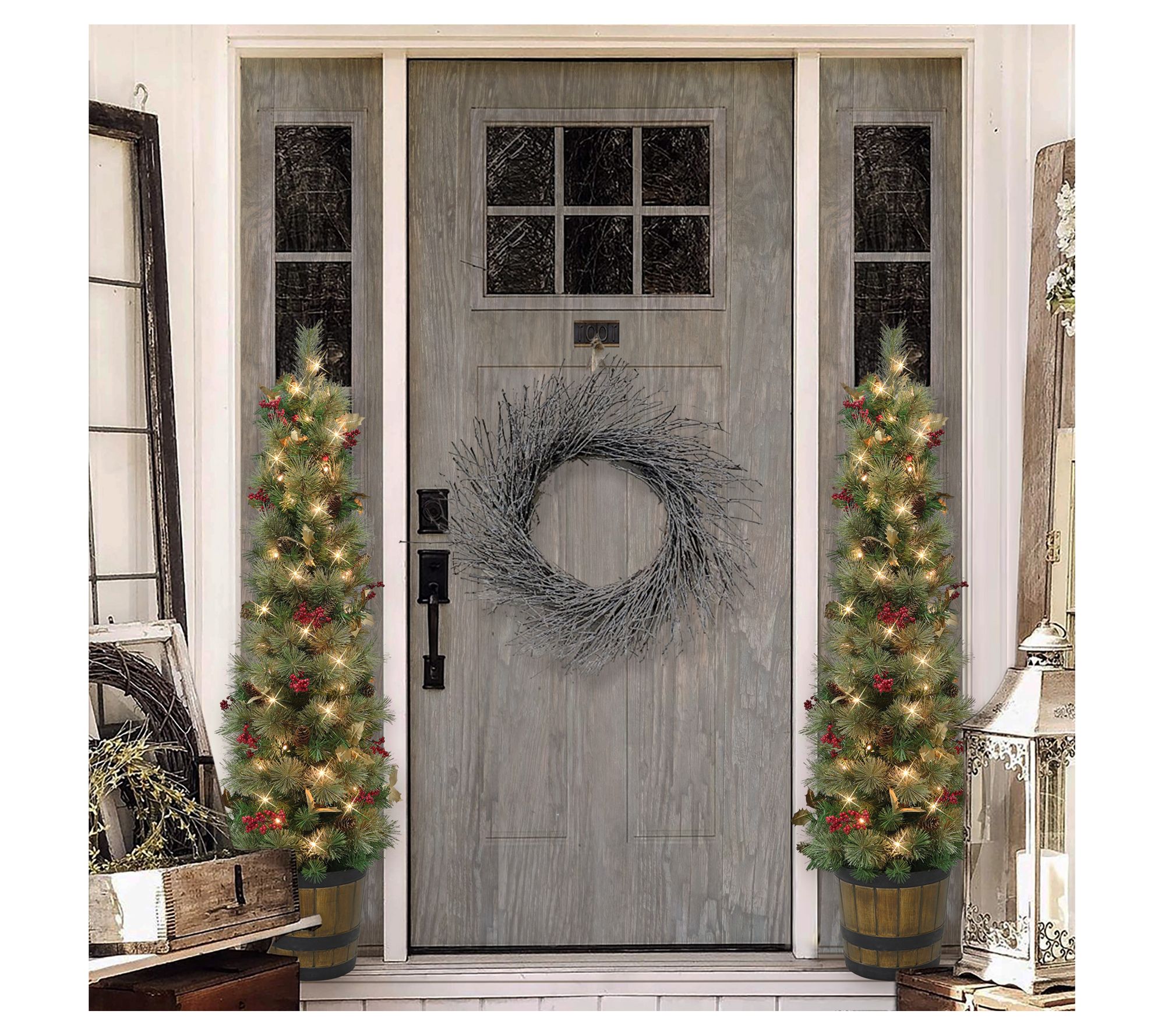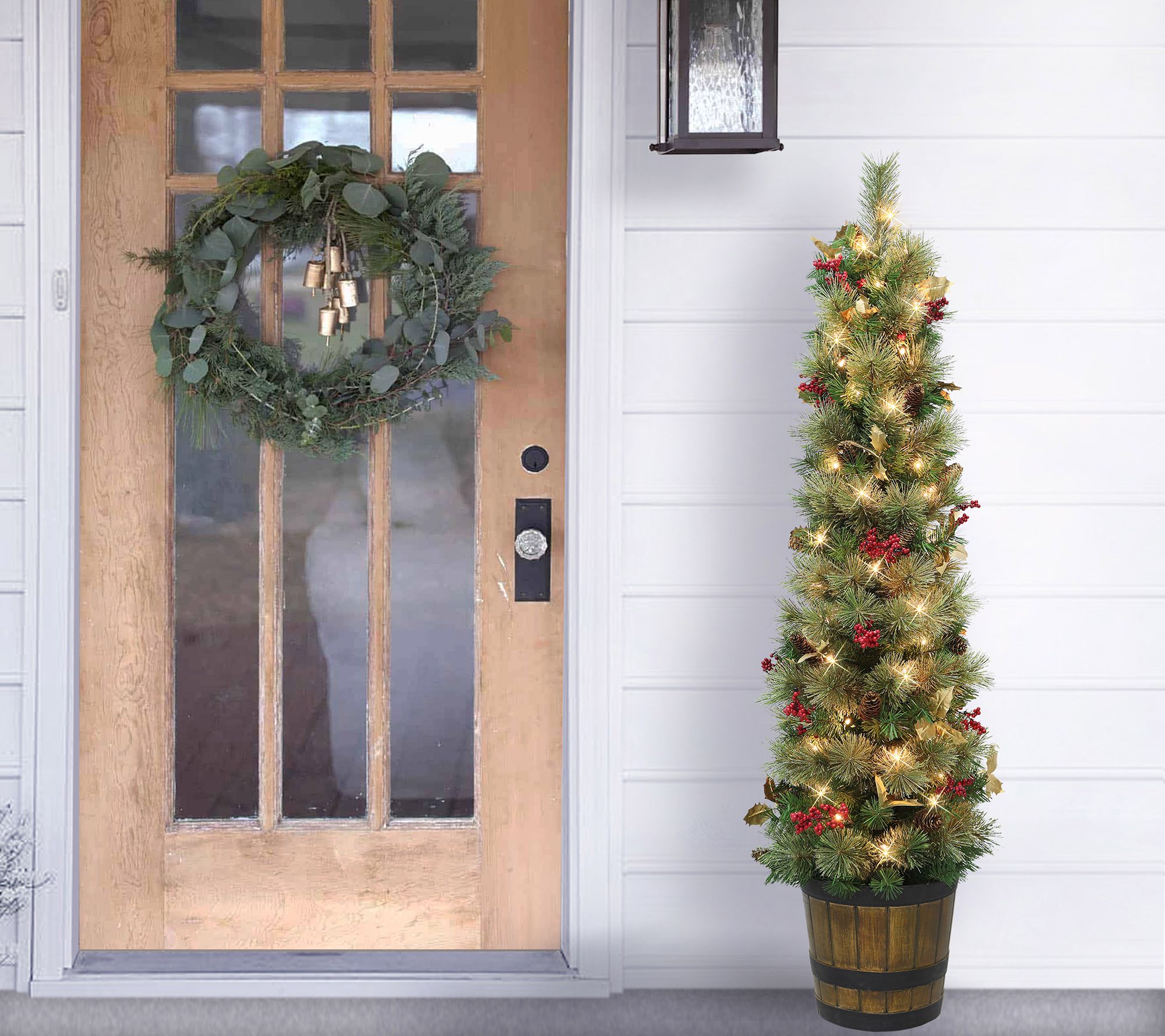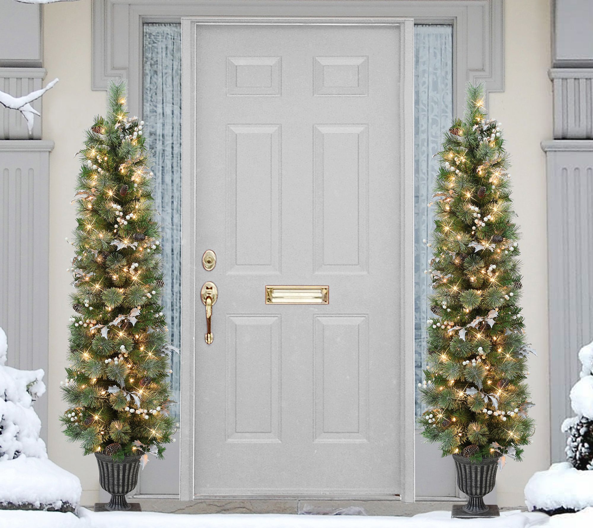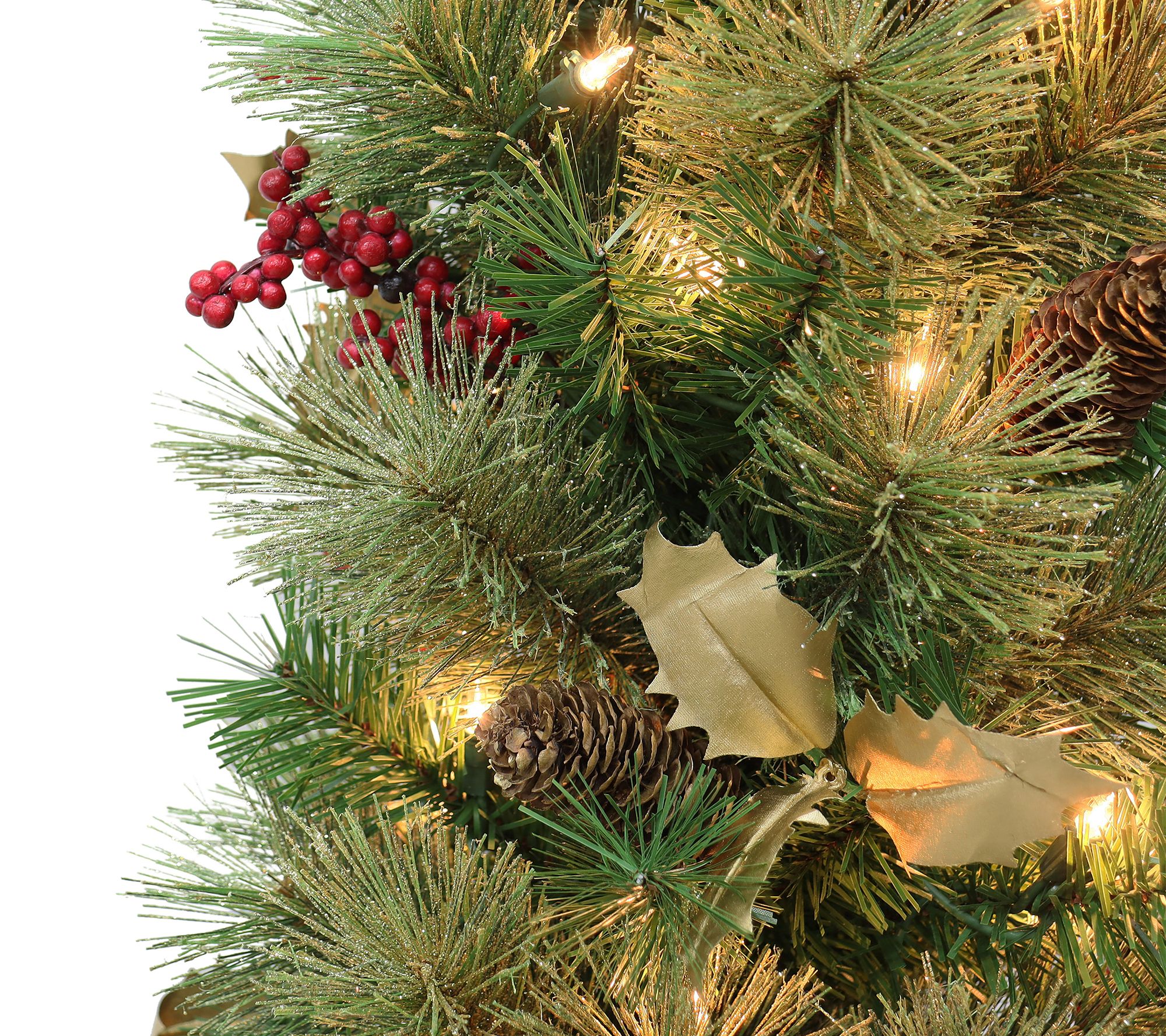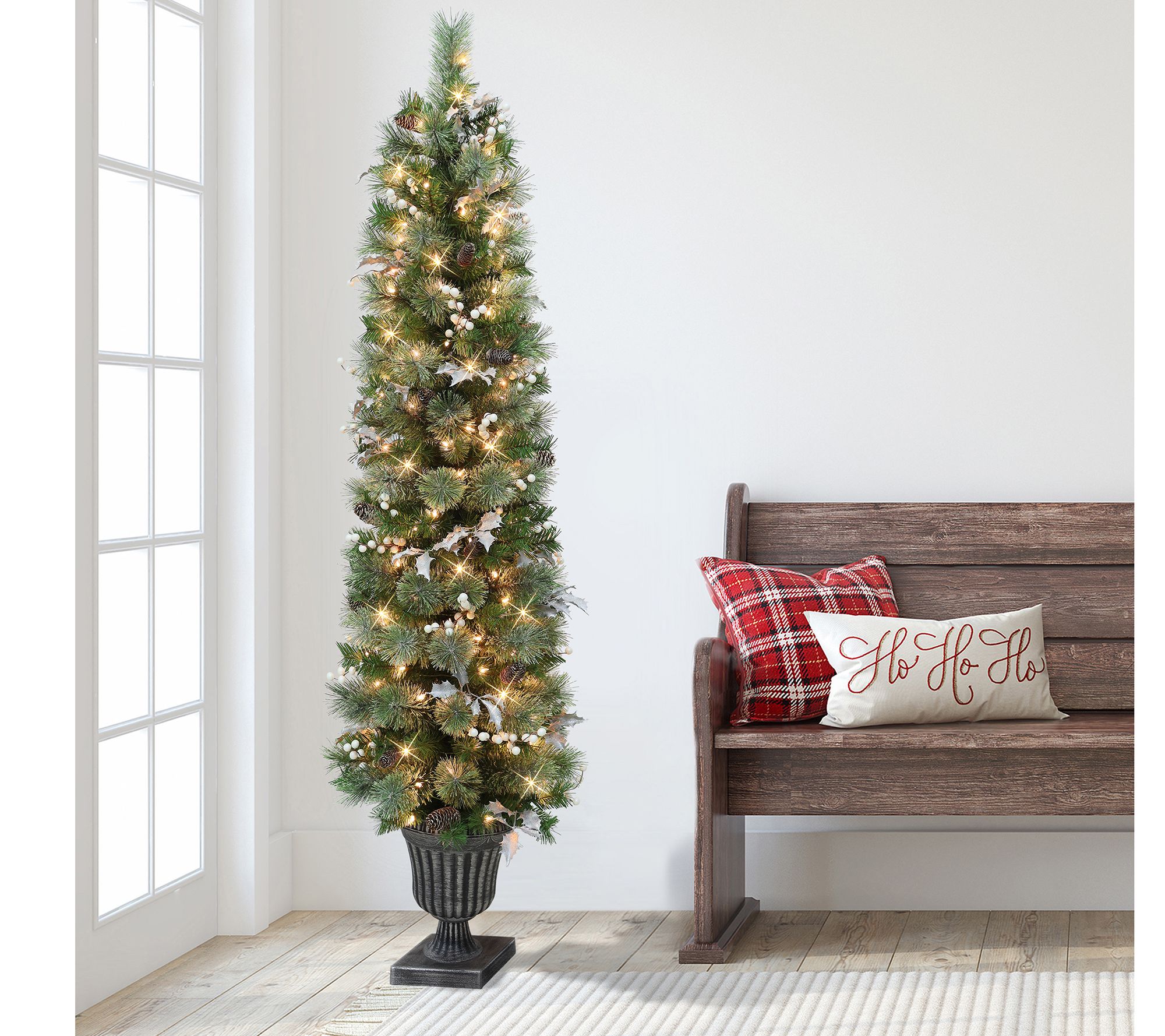 Tucked into an elegant pot and accented by pinecones, shimmering silvery holly leaves, and plump white berries, this faux pine tree brings the beauty of the holiday season to your home. From Puleo International.