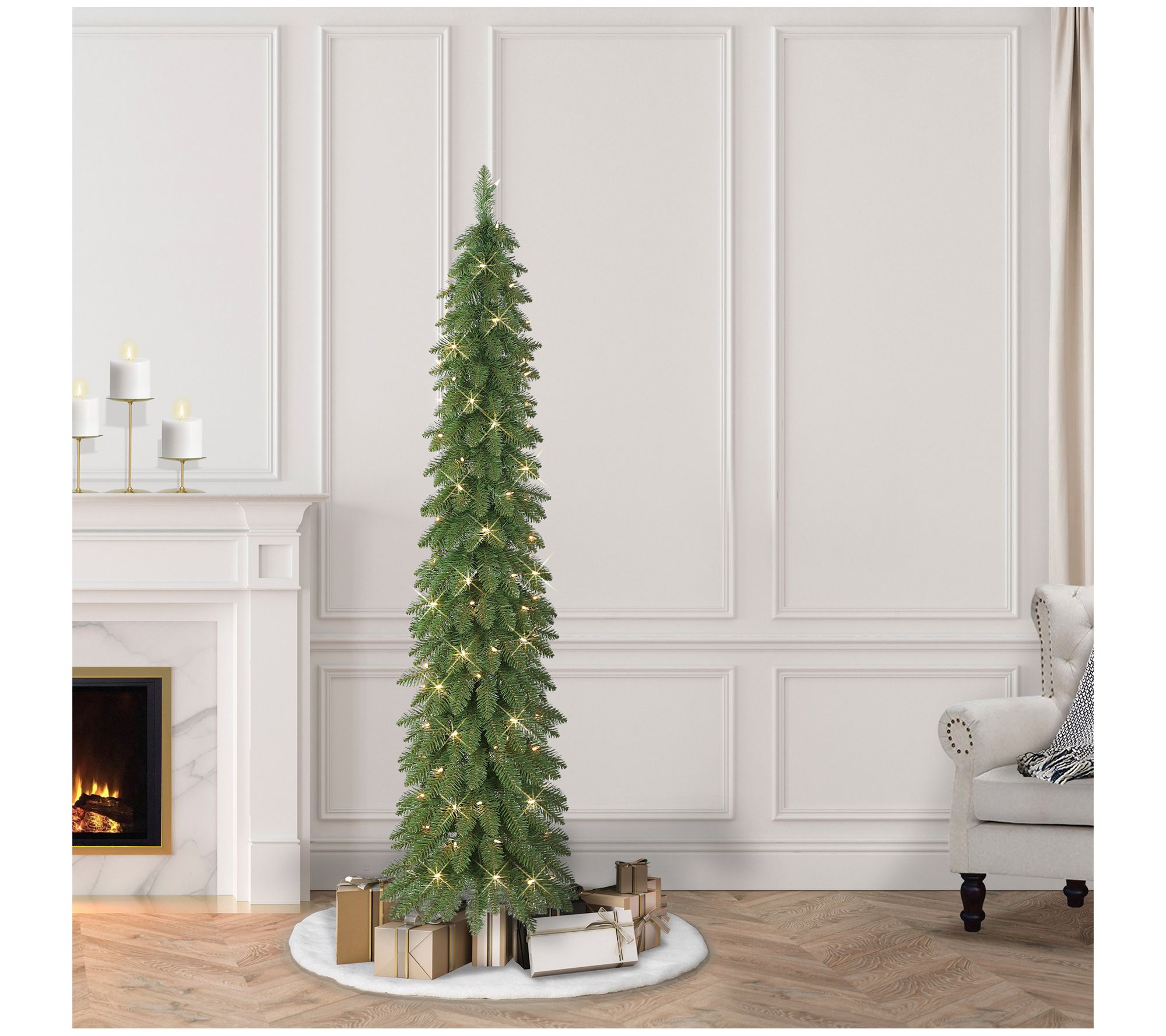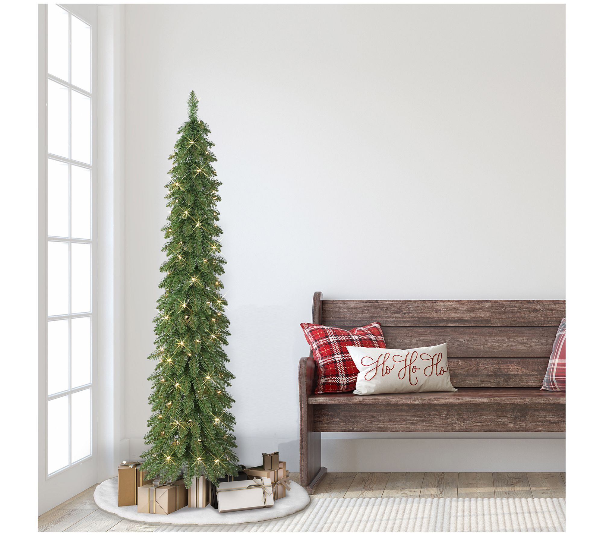 Welcome guests to your home with the authentic design of this pre-lit tree decorated in a slim profile for space-saving convenience. From Puleo International.