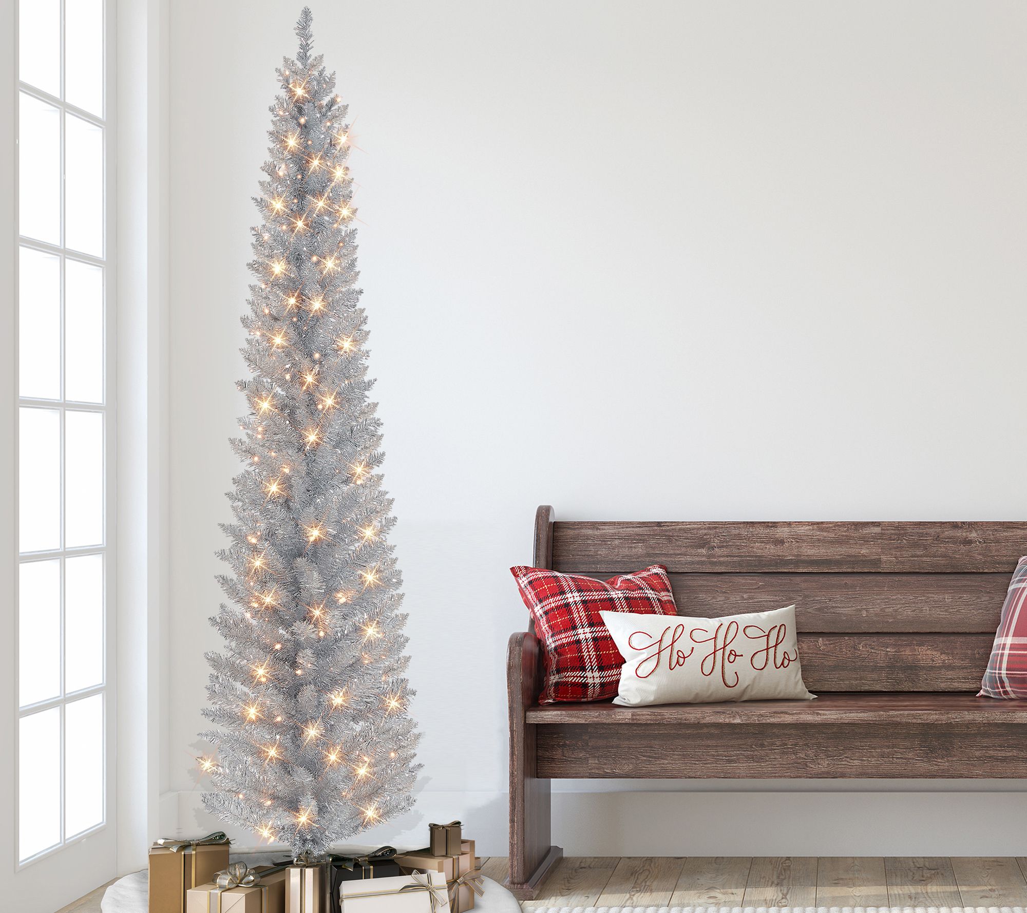 Have a tight spot set aside for your tree? This slim one fits in small spaces but features a tall silhouette that's sure to dazzle your guests. Featuring a plethora of lights and a silvertone finish, it adds some sparkle to your space. All it needs are some of your favorite ornaments to dress it up for Santa's arrival. From Puleo International.