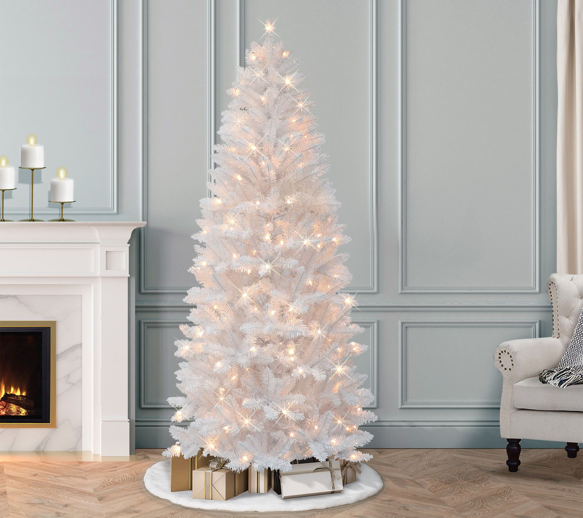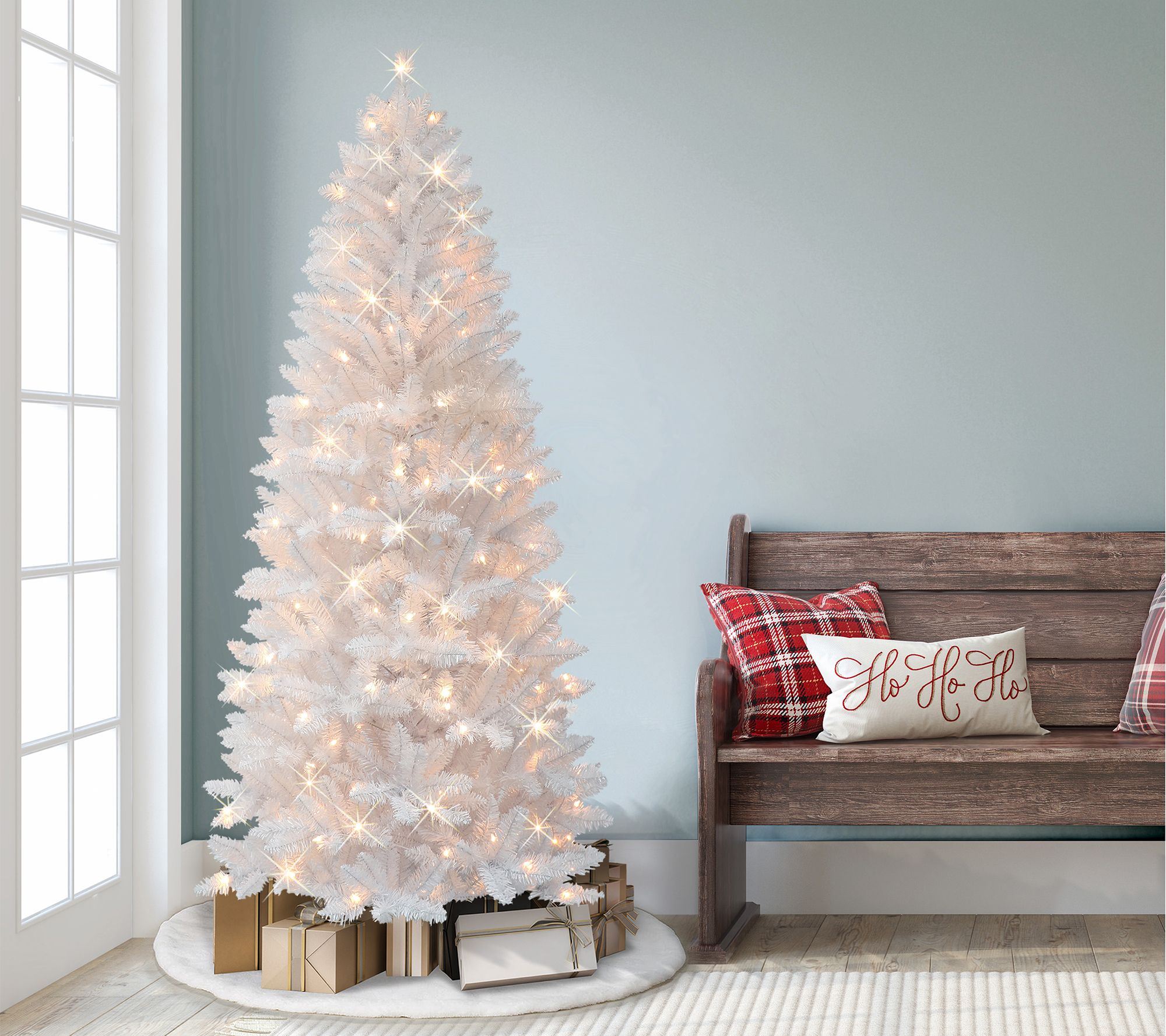 Here's a sophisticated take on your holiday decor! This artificial Carson Pine tree stands elegantly in white and sparkles with the glow of 200 clear lights. From Puleo International.