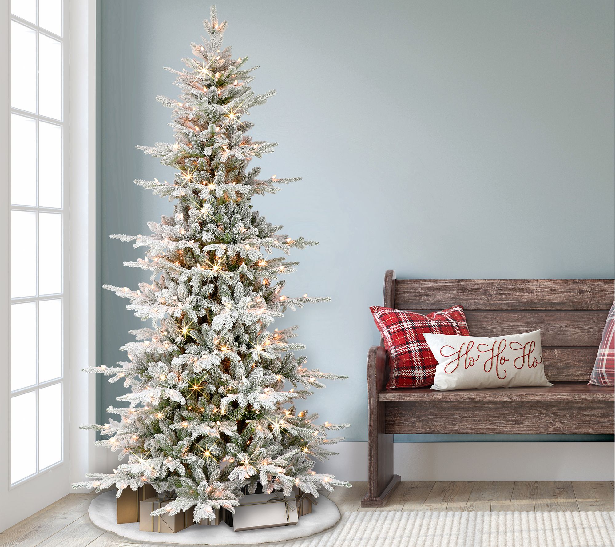 Illuminate your home with the warmth and charm of this slim-profile tree featuring snowy branches set with a plentiful array of lights. From Puleo International.