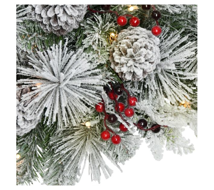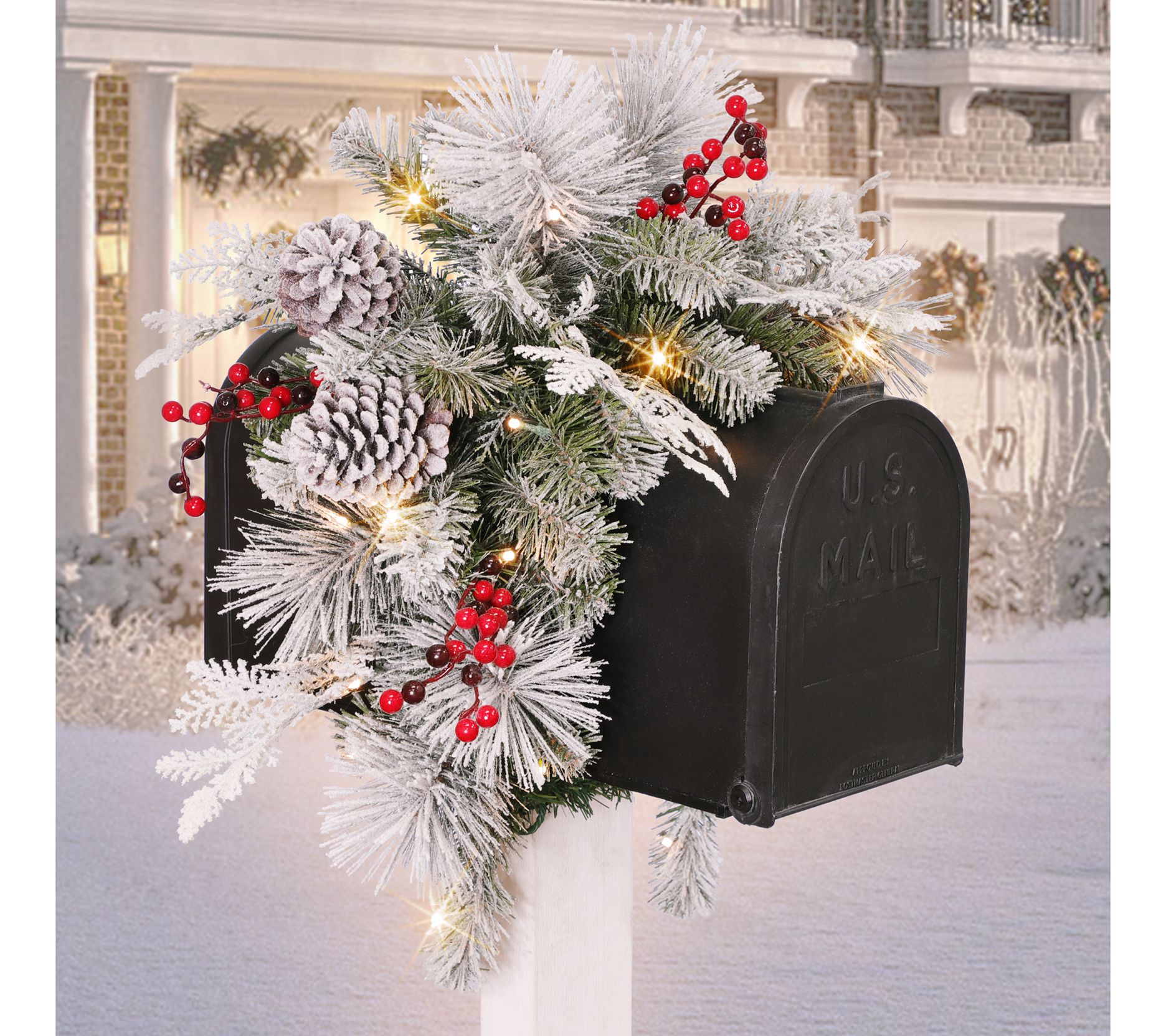 Transform your mailbox into a winter wonderland with this cover boasting a lush design with snow-dusted pine needles, vibrant berries, and lifelike pinecones. Warm white lights bring a festive glow to your outdoor decor. From Puleo International.
