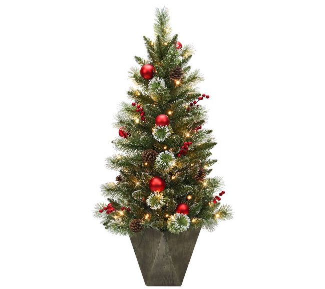 Brighten your holiday season with the Puleo International pre-lit potted adorned Christmas tree. This charming 4-foot tree is beautifully decorated with pinecones, berries, and red ornaments, creating a festive focal point in any room. Its warm white LED lights add a cozy glow, making setup a breeze. From Puleo International.