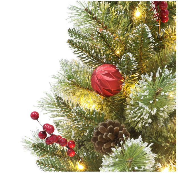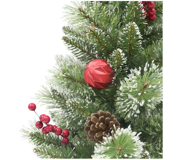 • Decorated with pinecones, berries, and red ornaments