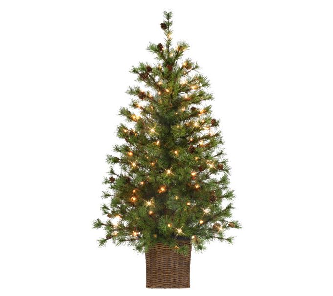 Give your space a festive update with this potted faux tree, a charming addition that lights up any corner with its clear incandescent lights. Offering easy assembly and a realistic rattan-look base, this beautiful tree combines convenience with style, making it a stunning holiday centerpiece. From Puleo International.