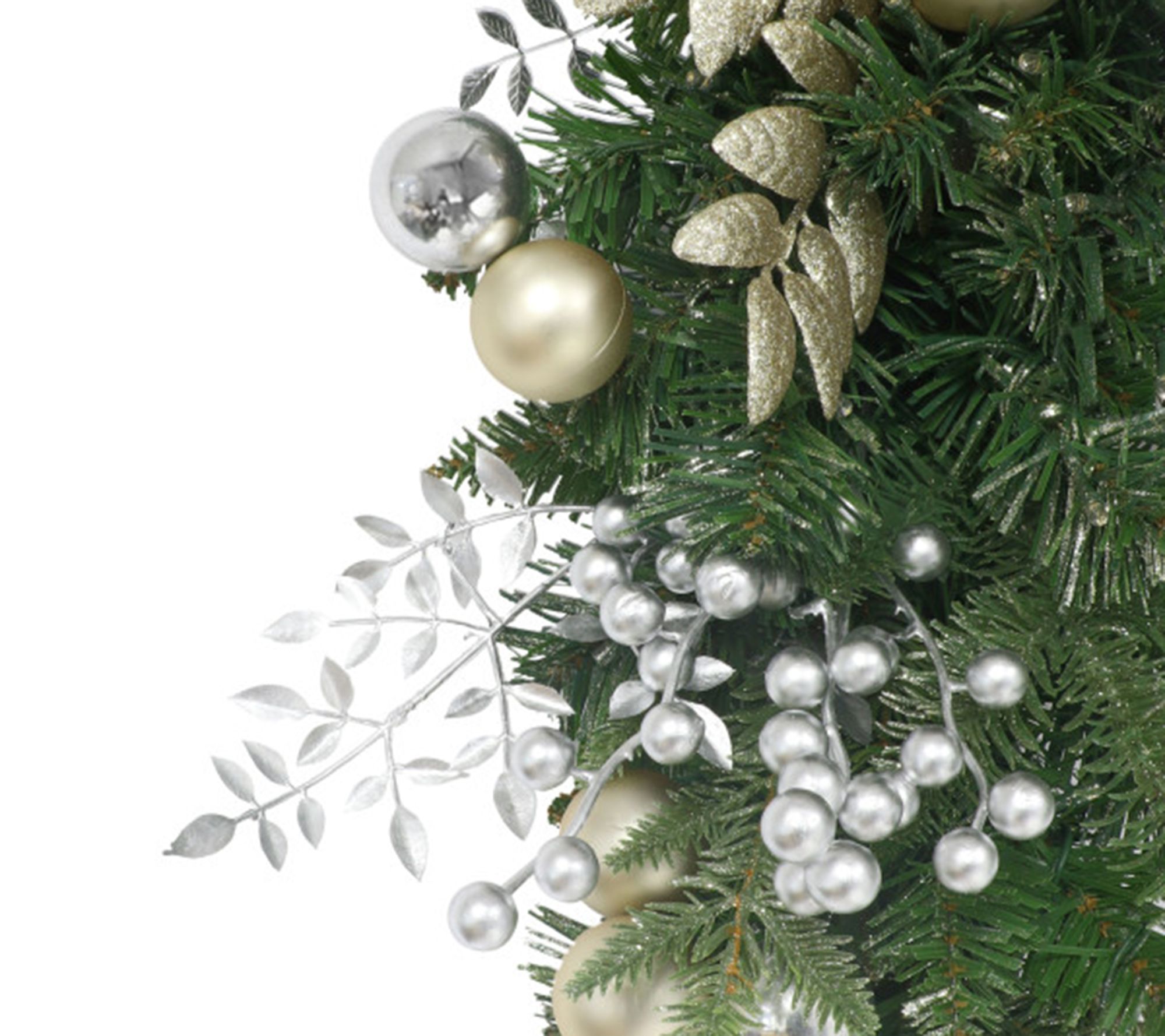 • Champagne balls, silvertone balls, lifelike goldtone leaves, silvertone leaves, and berries