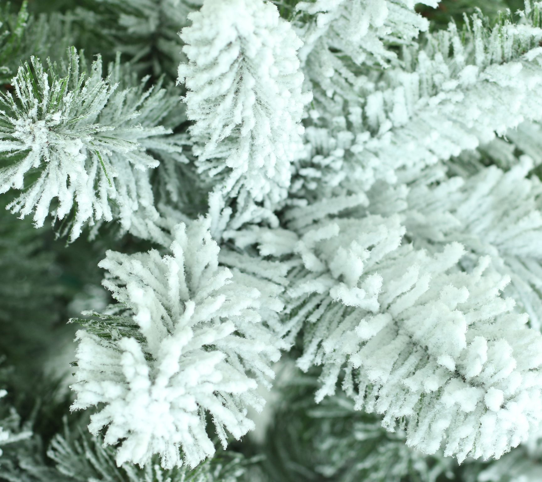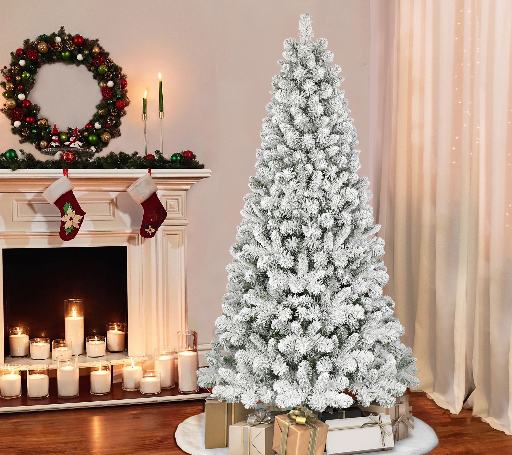 Transform your living room into a winter wonderland with this beautiful faux Virginia pine tree, showcasing snowy flocked branches that are ready for your ornaments. From Puleo International.