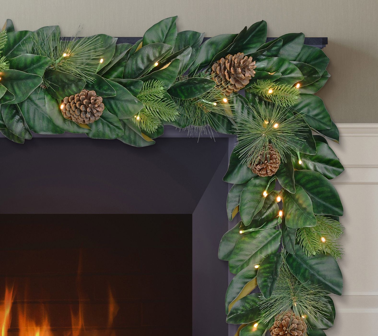 Bring the holiday spirit to your home with this 6-foot garland adorned with warm white lights and decorative pinecones, offering a realistic look with plentiful branch tips for a full, natural appearance. Perfect for indoor or covered outdoor display, it's easy to set up for a festive touch on banisters, mantles, or porches. From Puleo International.