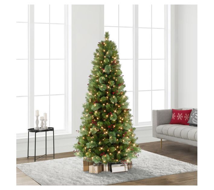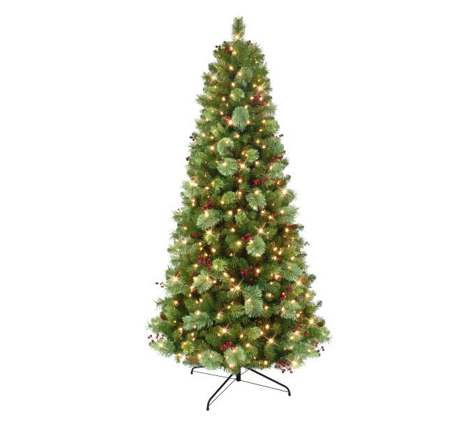 Add a touch of elegance to your holiday decor with this faux Washington spruce tree. This prelit tree dazzles with warm white LED lights, saving you the hassle of stringing bulbs, while its lush branches are adorned with pinecones and red berries to create a festive centerpiece that's easy to assemble and built to last. From Puleo International.