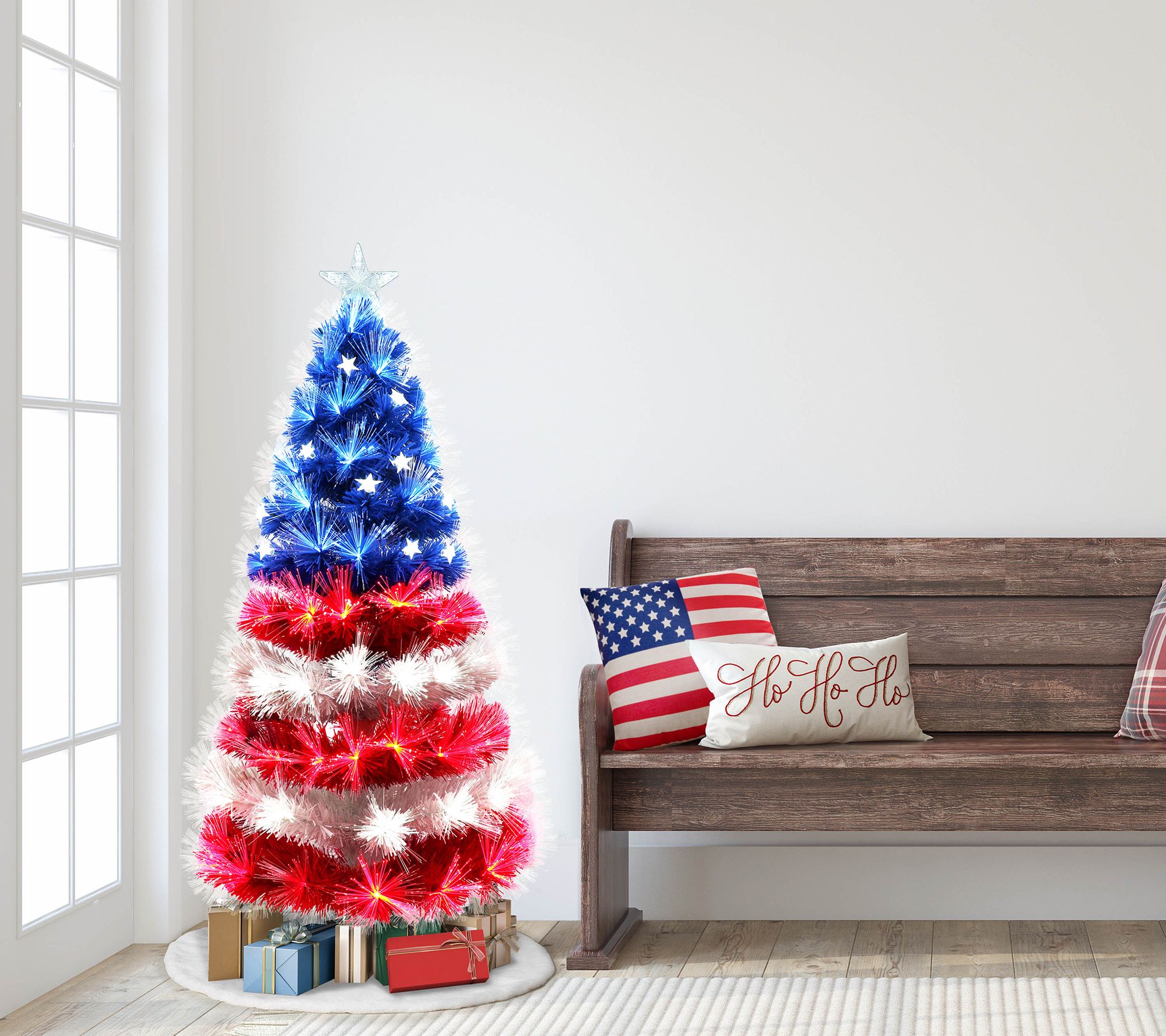 Finally, your love for your country and the magic of the season combine to provide you with your ultimate dream -- a patriotic Christmas tree. Constructed with 130 branch tips, this unique addition features a red, white, and blue design along with 130 fiber optic LED lights to help you create a dazzling holiday display. From Puleo International.
