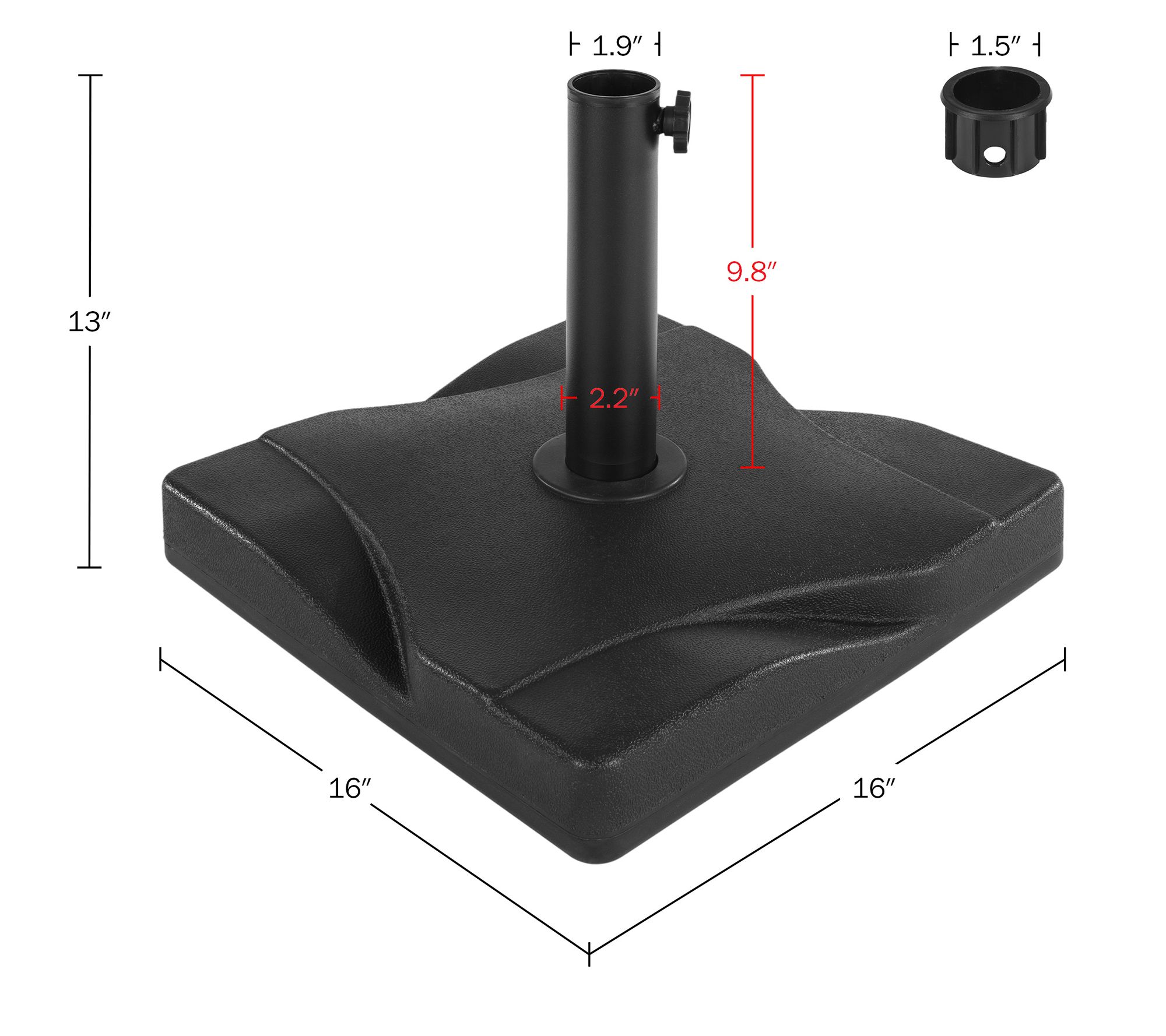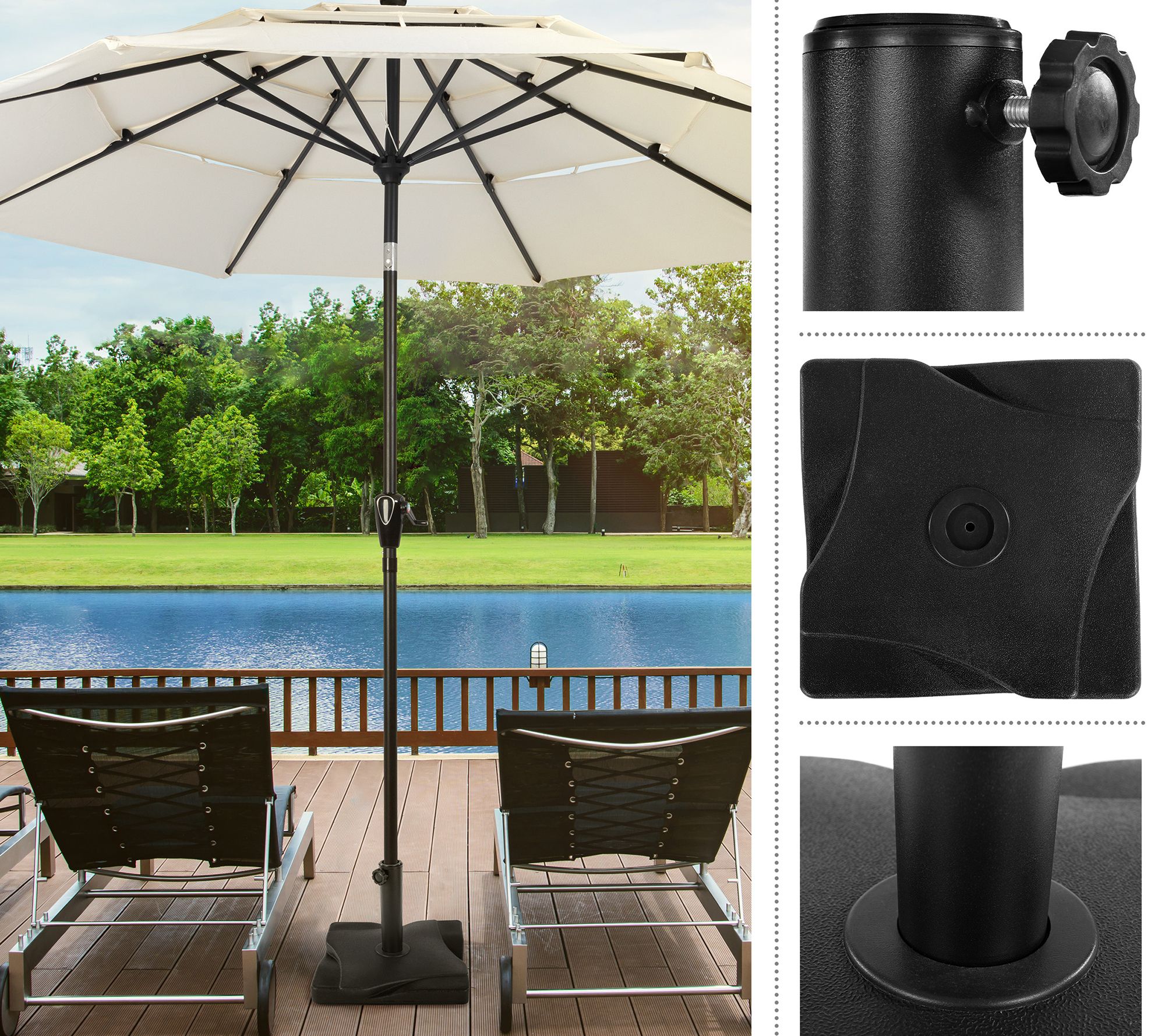 • Designed to support table, tilt, and freestanding umbrellas ranging from 6ft to 9ft with pole diameters between 1.5" and 1.9"
