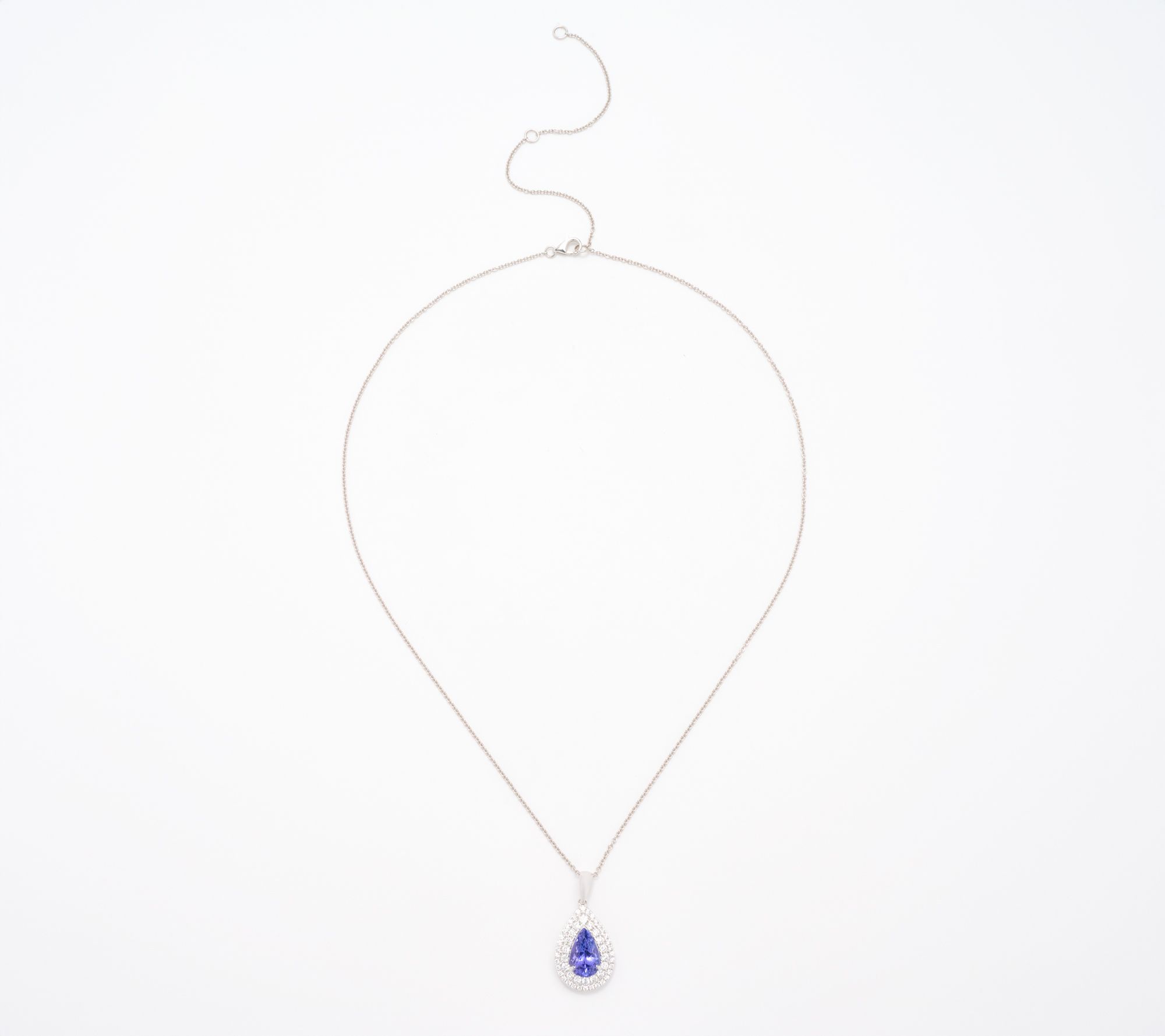 Make a lasting impression at your next special event with this eye-catching necklace, where a pear-shaped heat-treated tanzanite shimmers at the center of a sparkling diamond halo. Paired with its coordinating 18" chain, this pendant necklace provides sophisticated color and brilliant elegance to any ensemble. From Pure Tanzanite.