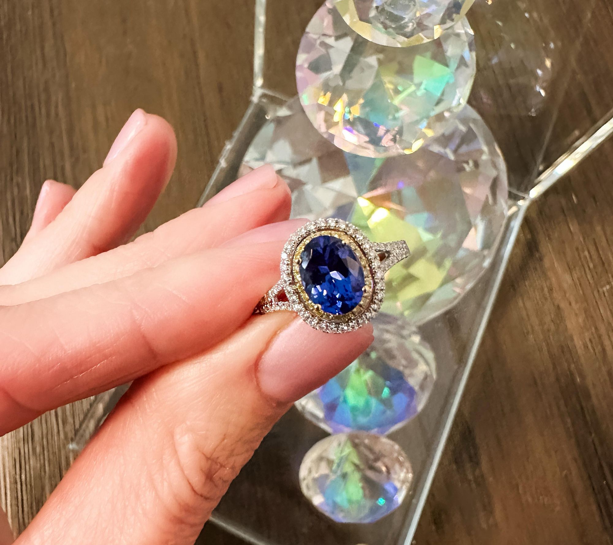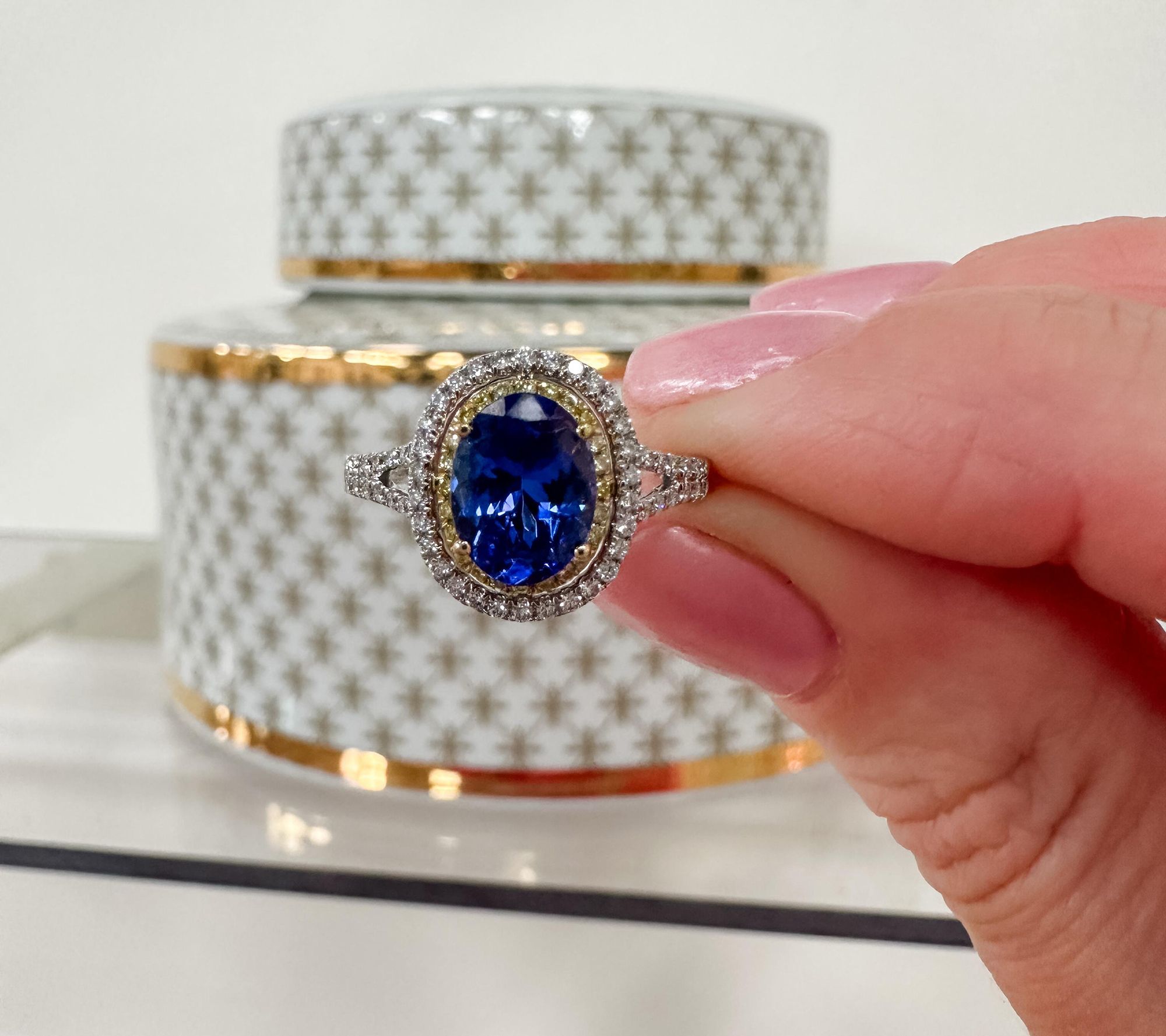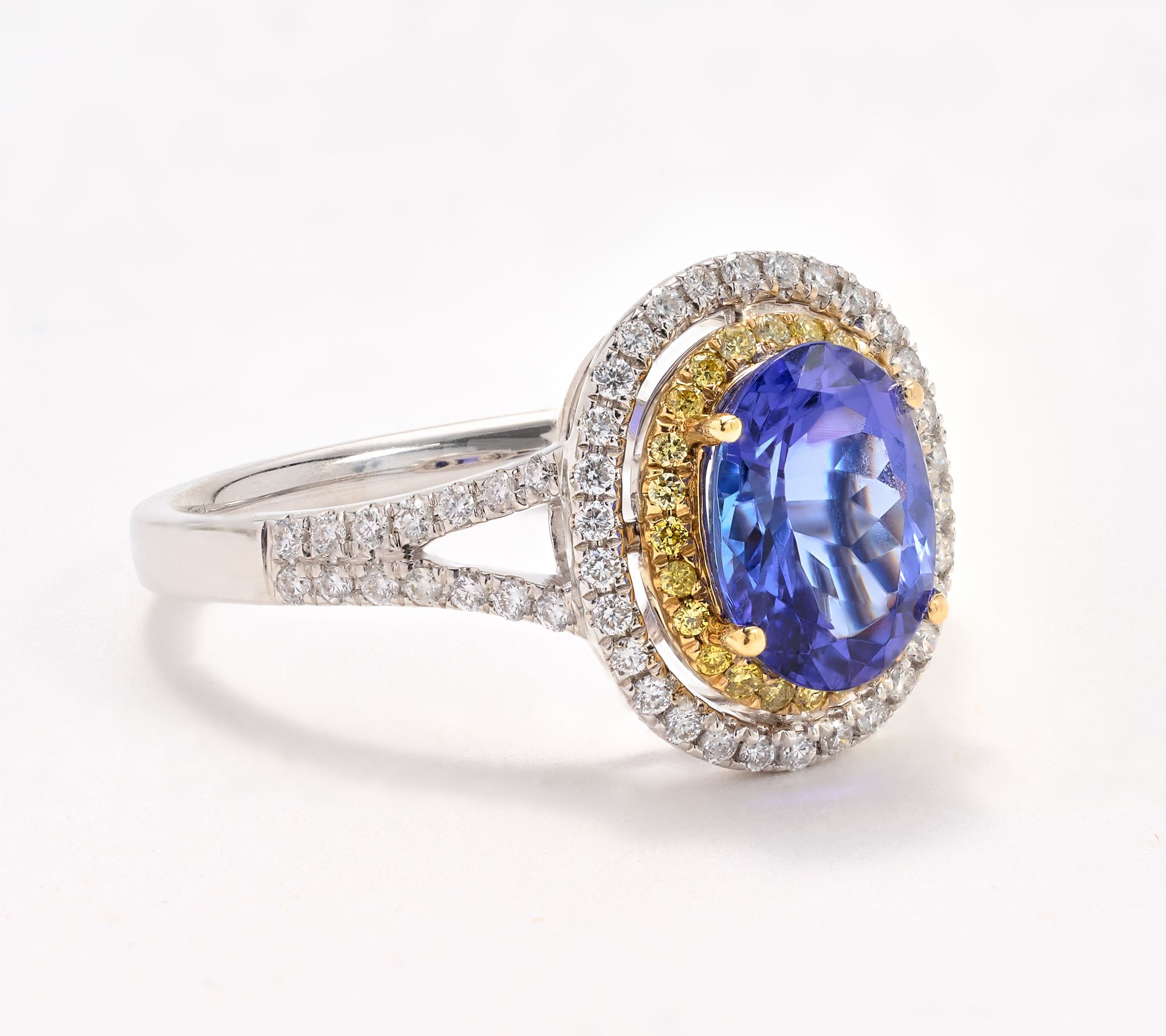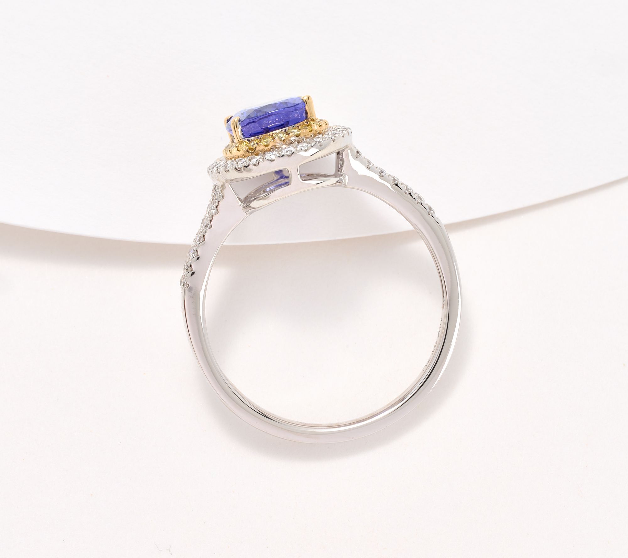 • Oval heat-treated tanzanite in prong setting; pave-set white and yellow round diamonds; two tone design