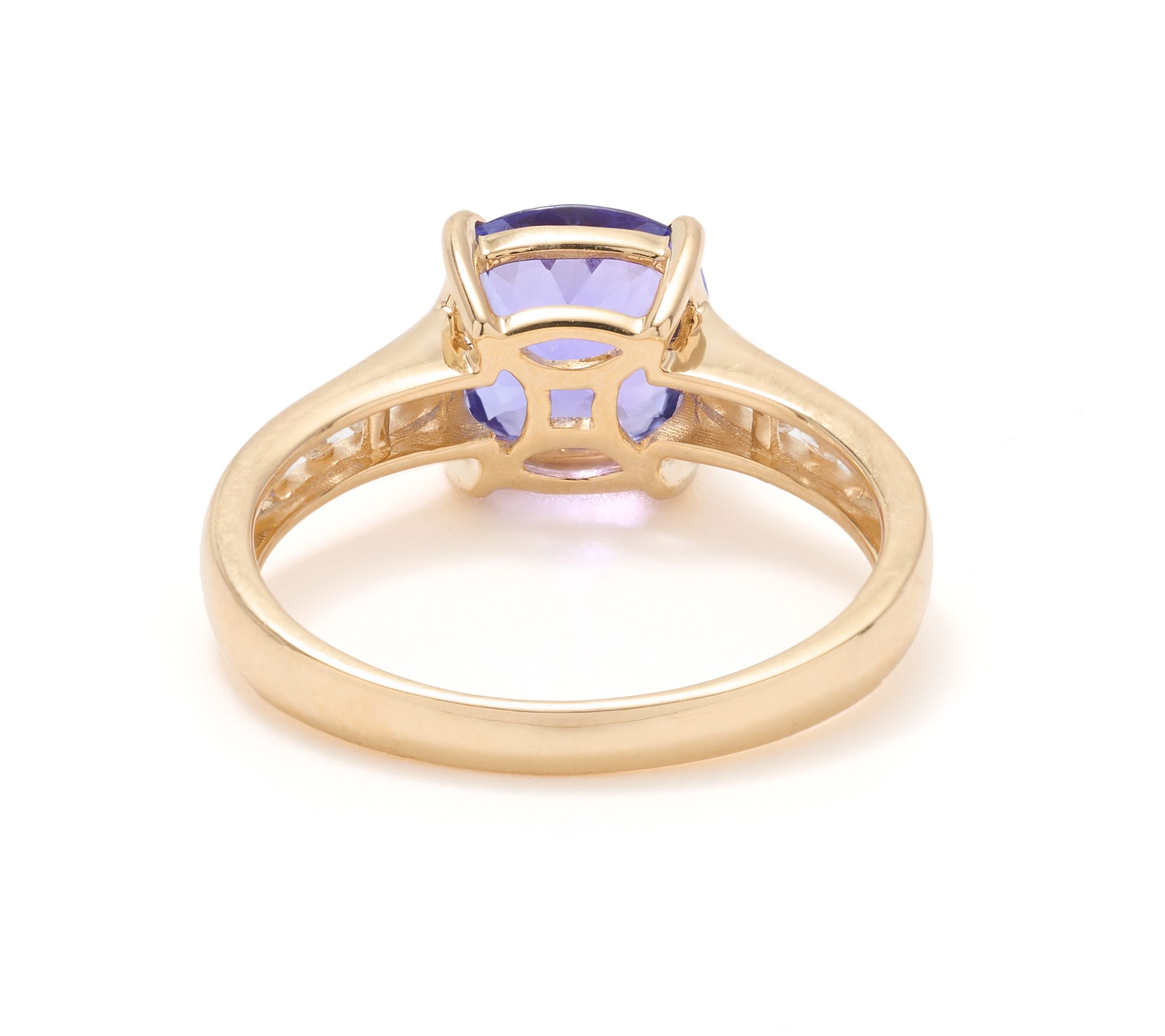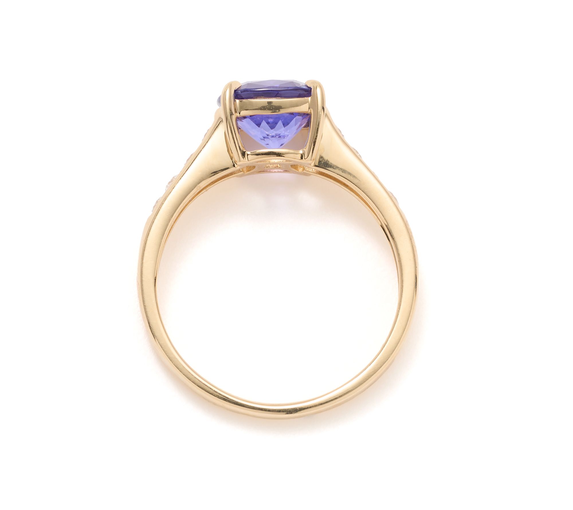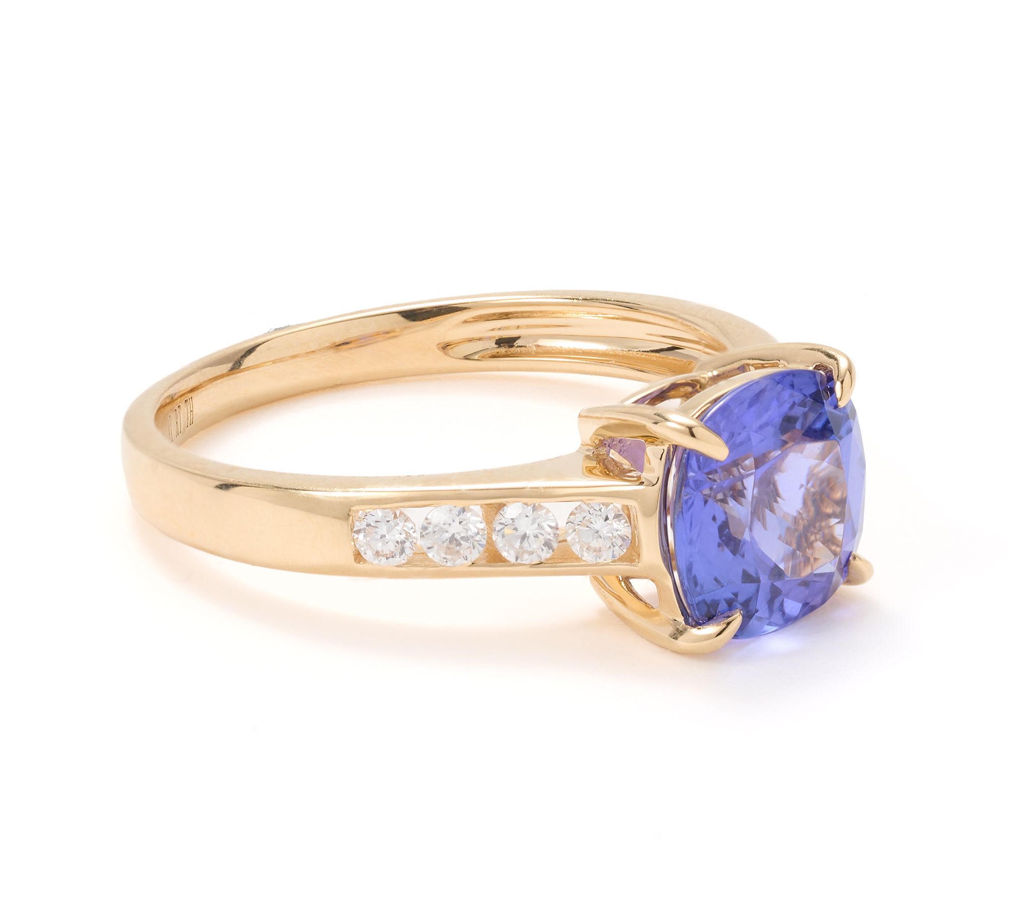 Positively captivating, this 18K gold ring from Pure Tanzanite by Jeff Moseley is like something straight out of a dream. The cushion-cut, heat-treated tanzanite gemstone effortlessly stands out (thanks to a simple yet sturdy prong setting) and features a sensational blue-violet hue you'll find yourself mesmerized by no matter how many times you wear it. Channel-set diamonds provide the perfect dose of sparkle to complement and enhance the beauty of the already exquisite ring. Worn to a special event, your house of worship, or simply taken for a spin around town, this stunner is sure to capture many admiring glances. From Pure Tanzanite by Jeff Moseley.