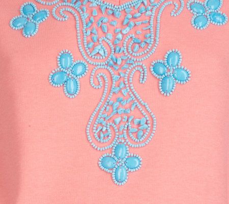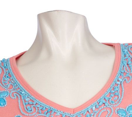 Rock on. Amp up the everyday with this lively look. Basic tees are great, but if you're ready to sing a new tune, try this rock-and-bead embellished T-shirt on for size. From Quacker Factory.